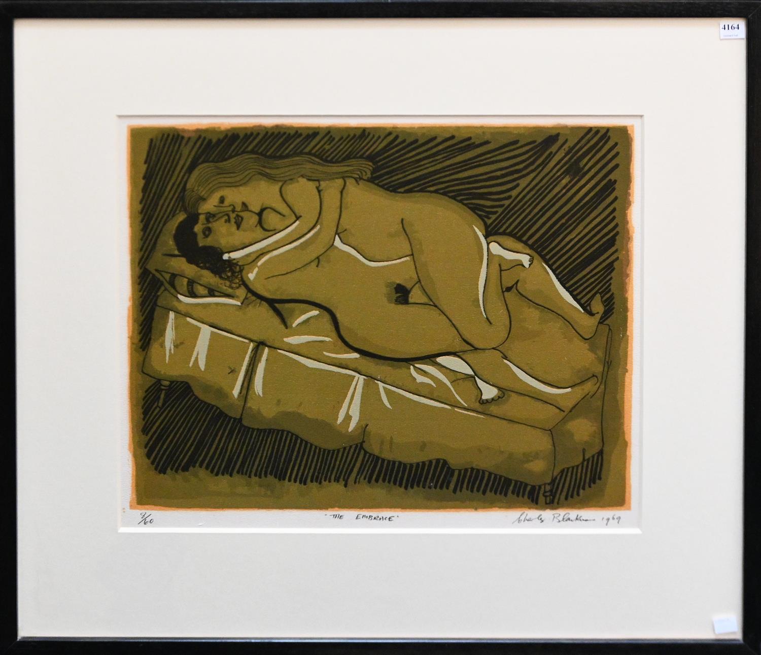 CHARLES BLACKMAN, THE EMBRACE 1969, SCREENPRINT ED. 8/60, SIGNED, DATED AND EDITIONED BELOW IMAGE, 41.5 X 52CM, FRAME SIZE: 70.5 X 78CM
