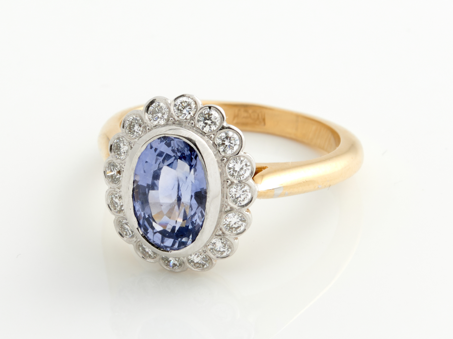A CEYLON SAPPHIRE AND DIAMOND RING IN 18CT TWO TONE GOLD, THE SAPPHIRE WEIGHING 2.16CT WITH DIAMONDS TOTALLING 0.38CT, SIZE L, 5.69GM
