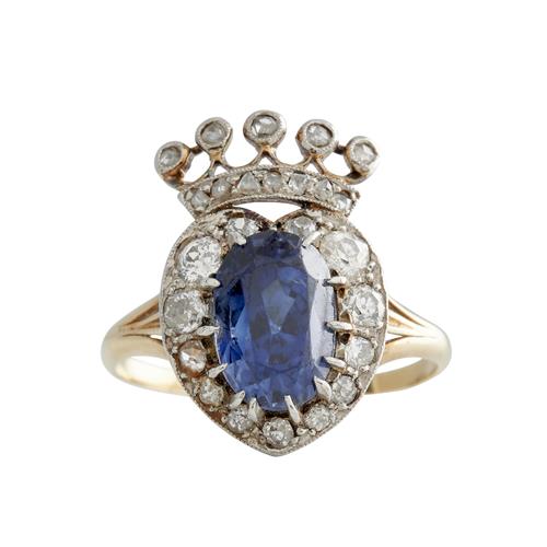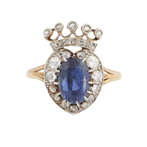 Modelled as a crowned heart, centring a claw-set oval-cut sapphire weighing approximately 3.50 carats, within a surround of old European-cut diamonds, size S.