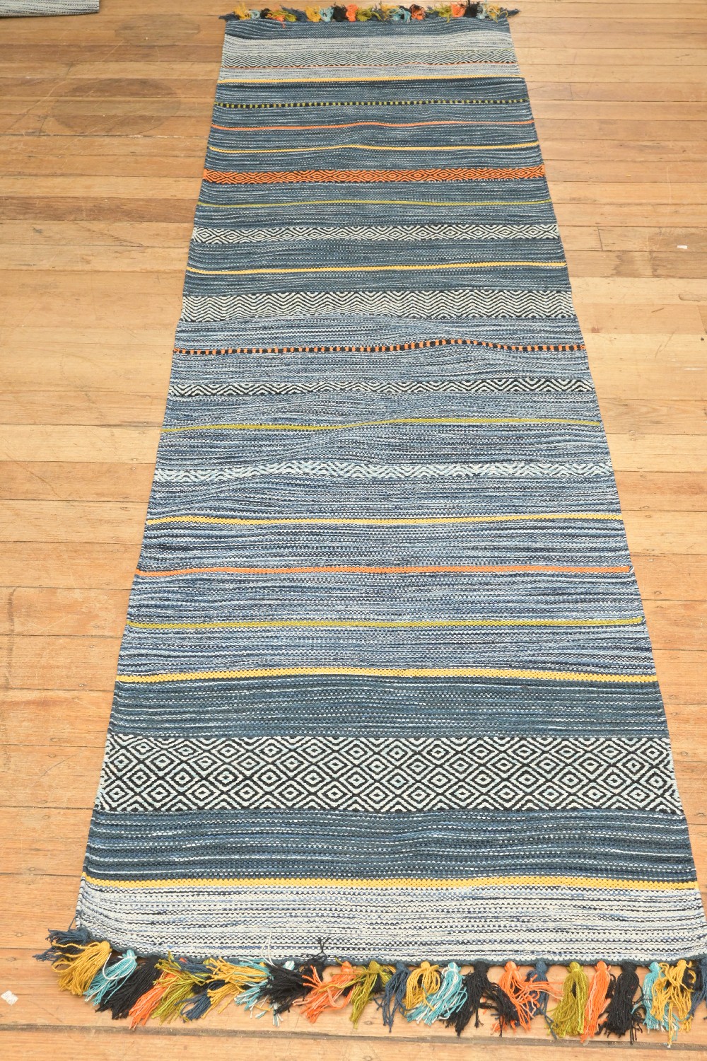 A BRAND-NEW L COLOURFUL, DENSELY HAND-WOVEN RAJASTHANI KILIM RUNNER. REVERSABLE. MADE FROM THE FINEST COTTON FLEECE. IN BLUE TONES. SIZE: 300 X 80 CM-ORIGIN: JAIPUR – RRP: $550