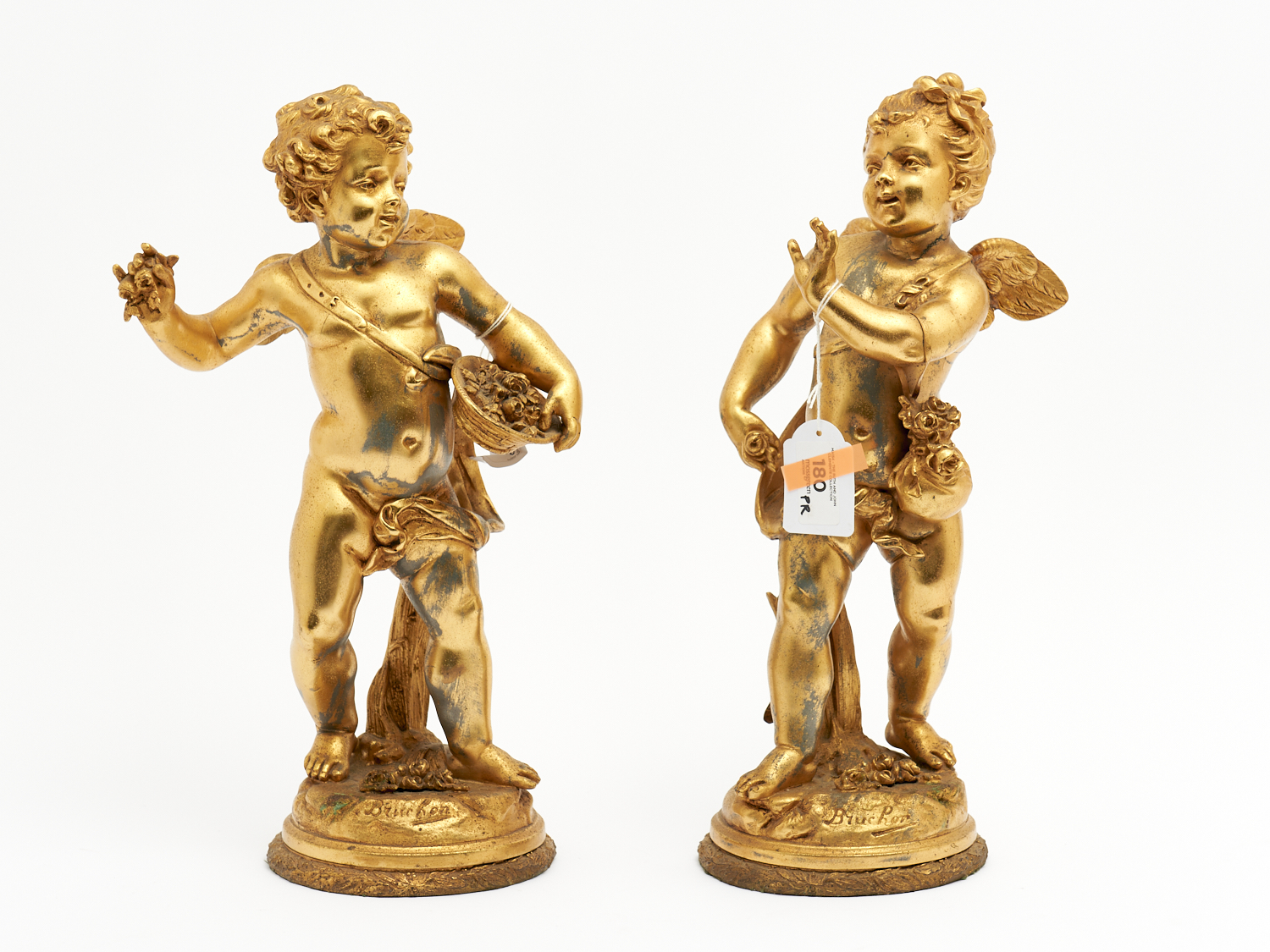A PAIR OF GILT METAL CHERUBS WITH A BASKET OF FLOWERS, SIGNED BRUCHON H.38CM, LEONARD JOEL DELIVERY SIZE: LARGE