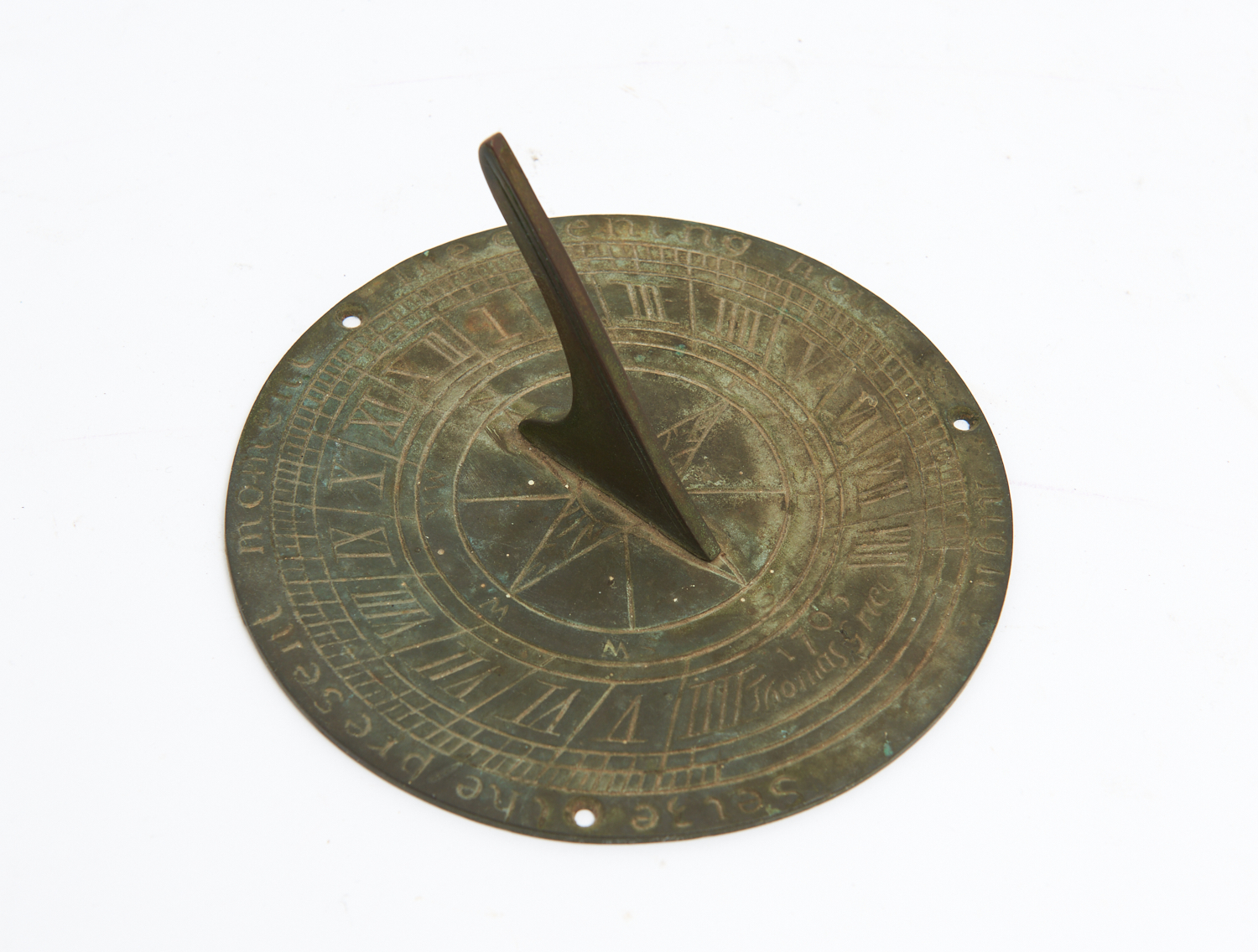 A BRASS SUNDIAL WITH THE DATE 1705 AND NAME THOMAS GRICE DIA.15CM, LEONARD JOEL DELIVERY SIZE: SMALL