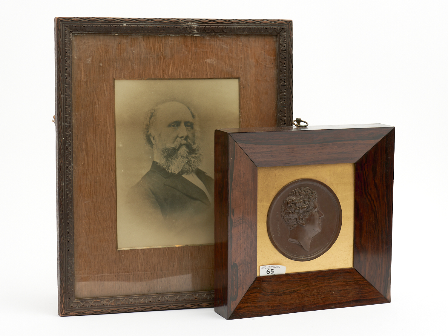 A BRONZE PORTRAIT MEDALLION OF GEORGE III PUB. BY S. PARKER XII IN ROSEWOOD FRAME TOGETHER WITH A FRAMED ANTIQUE PHOTO OF A GENTLEMAN DIA.11.5CM (MEDALLION), LEONARD JOEL DELIVERY SIZE: MEDIUM