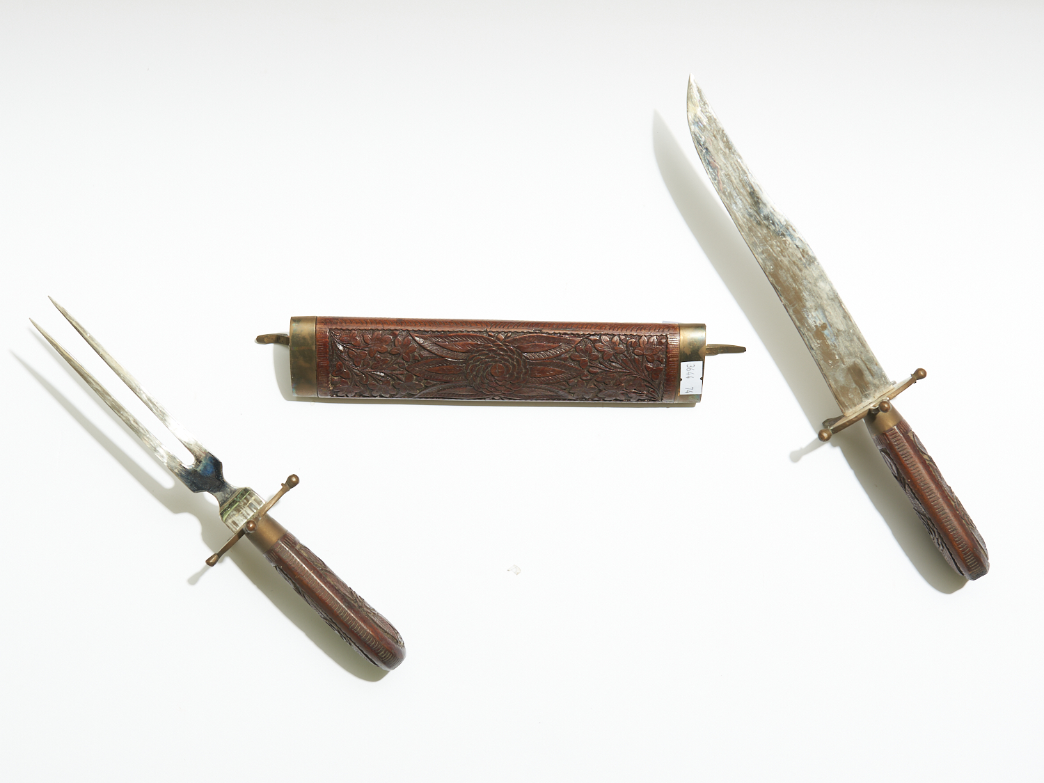 AN INDIAN CARVED WOOD AND BRASS MOUNTED CARVING KNIFE AND FORK L.46CM *Please note the purchaser of this item will require a weapons licence and a copy will be taken upon collection, LEONARD JOEL DELIVERY SIZE: MEDIUM