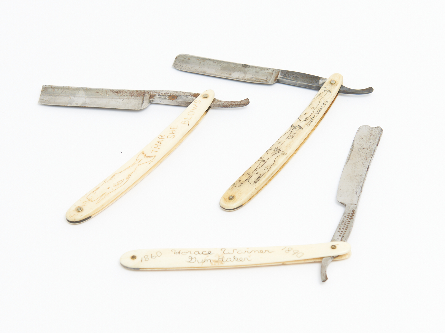 THREE BONE HANDLED AND ENGRAVED CUT THROAT RAZORS, 19TH CENTURY L.16.5CM (LONGEST) FROM THE MARITIME COLLECTION OF DESMOND ADCOCK, MOSSGREEN, 2013, LEONARD JOEL DELIVERY SIZE: SMALL