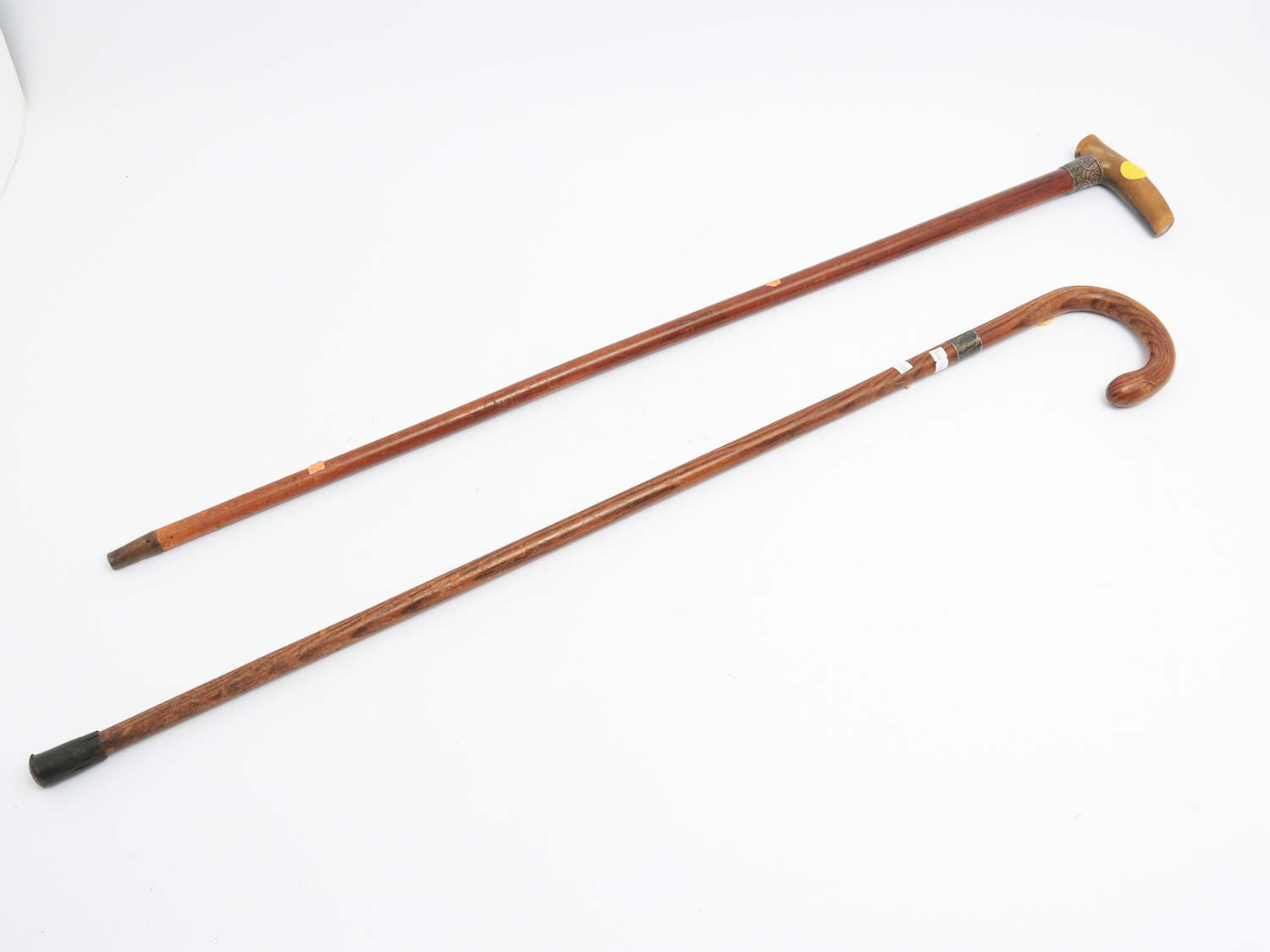 A 19TH CENTURY HORN HANDLE WALKING STICK WITH SILVER COLLAR, TOGETHER WITH ANOTHER SILVER COLLARED WALKING STICK 92.5CM (LONGEST), LEONARD JOEL DELIVERY SIZE: MEDIUM
