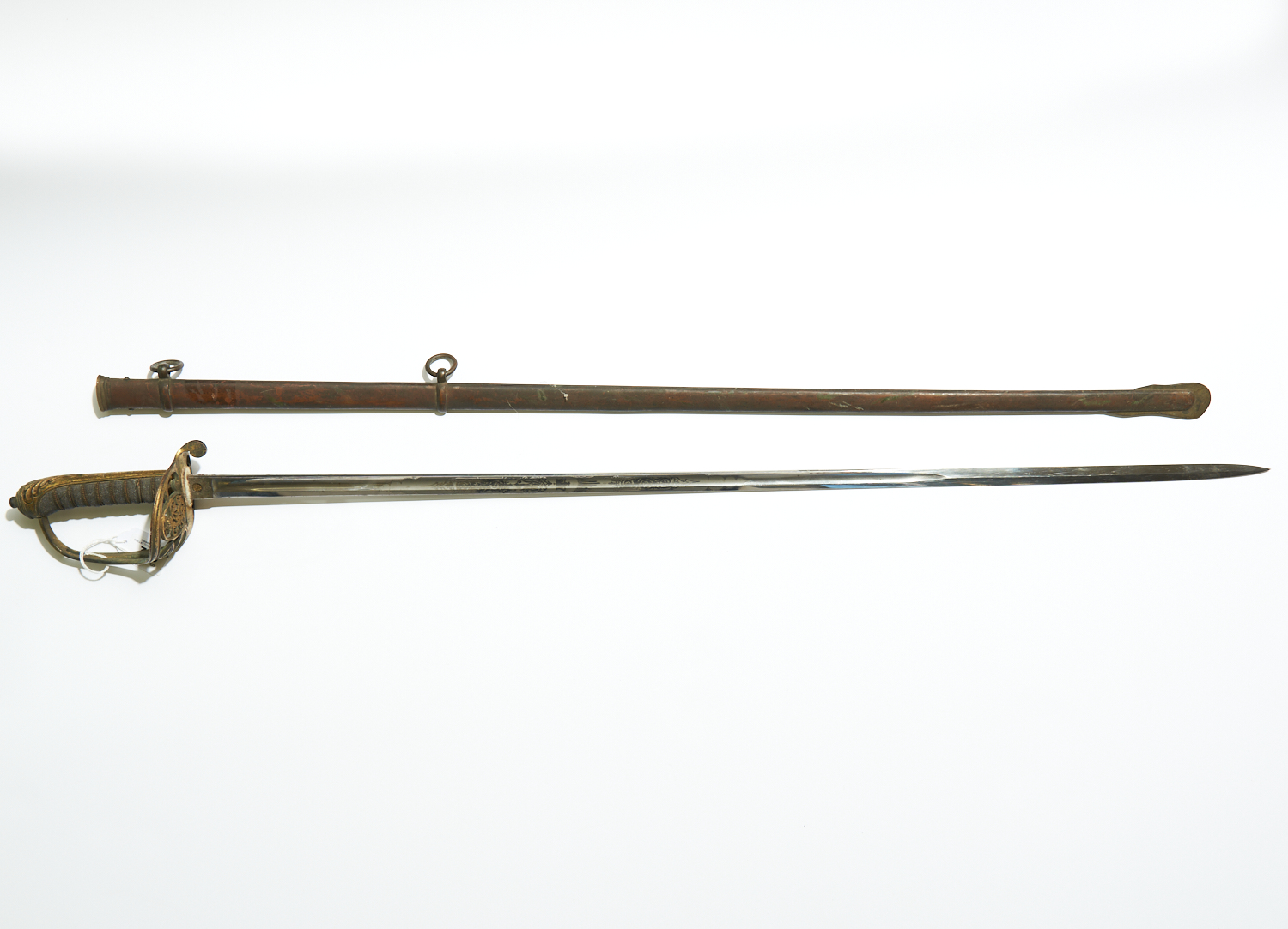 AUSTRALIAN MILITARY OFFICERS PARADE SWORD C1890S. ACID ETCHED BLADE IN EXCELLENT CONDITION STAMPED 'MOWBRAY, ROWAN AND HICKS, MELBOURNE'. QUEEN VICTORIA MONOGRAM AND CROWN ON THE GUARD. WITH SCABBARD (ORIGINAL PATINA), MINOR WIRE WORK DAMAGE TO GRIP. L.102CM, *Please note the purchaser of this item will require a weapons licence and a copy will be taken upon collection, LEONARD JOEL DELIVERY SIZE: LARGE