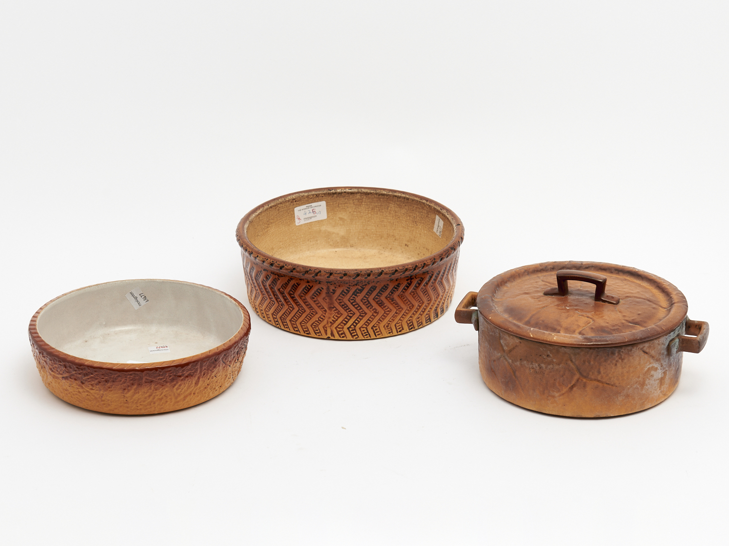 TWO FRENCH OPEN PASTRY FORM DISHES AND ONE CASSOULET,19TH CENTURY DIA.24CM (LARGEST) (A/F), LEONARD JOEL DELIVERY SIZE: MEDIUM