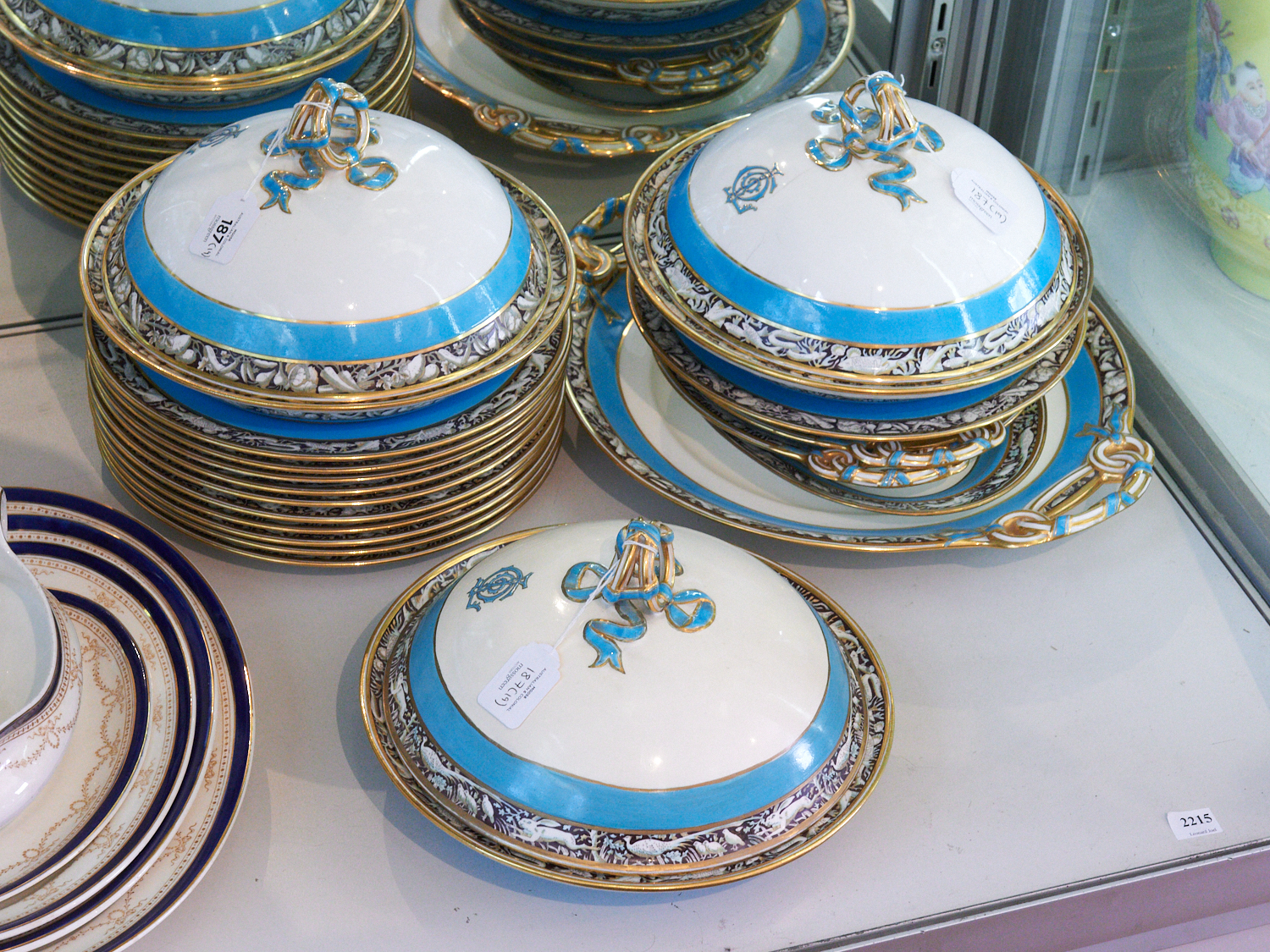A GEORGE LANSELL CRESTED FAMILY PORCELAIN DINNERWARE BY MINTONS INCLUDING THREE TUREENS, SERVING PLATTERS, PLATES, AND DISHES (A/F NUMEROUS REPAIRS), LEONARD JOEL DELIVERY SIZE: LARGE