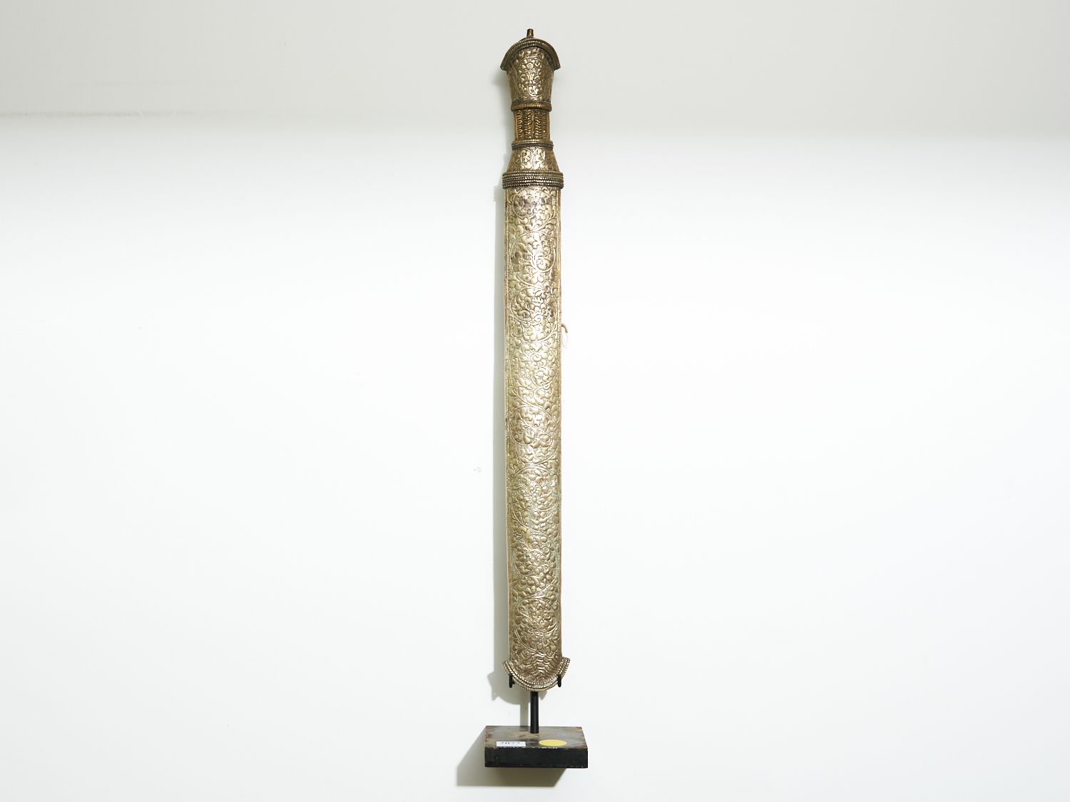 AN ANTIQUE SHORT SWORD IN EMBOSSED METAL SHEATH, ON CUSTOM STAND L.60CM (SWORD), *Please note the purchaser of this item will require a weapons licence and a copy will be taken upon collection, LEONARD JOEL DELIVERY SIZE: MEDIUM