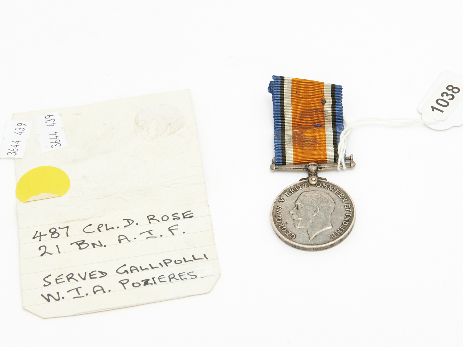A BRITISH MILITARY SERVICE MEDAL, WORLD WAR I WITH ADDITIONAL NOTES: '487 CPL.D ROSE 21 BN A.I.F. SERVED GALLIPOLLI W.I.A. POZIERES' W.3.5CM, LEONARD JOEL DELIVERY SIZE: SMALL