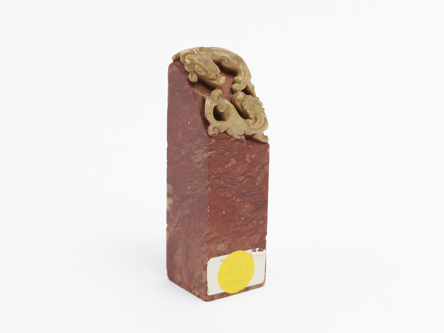 A CHINESE RED AND GREEN STONE SEAL ADORNED WITH A PAIR OF CARVED KYLINS H.13CM, LEONARD JOEL DELIVERY SIZE: SMALL