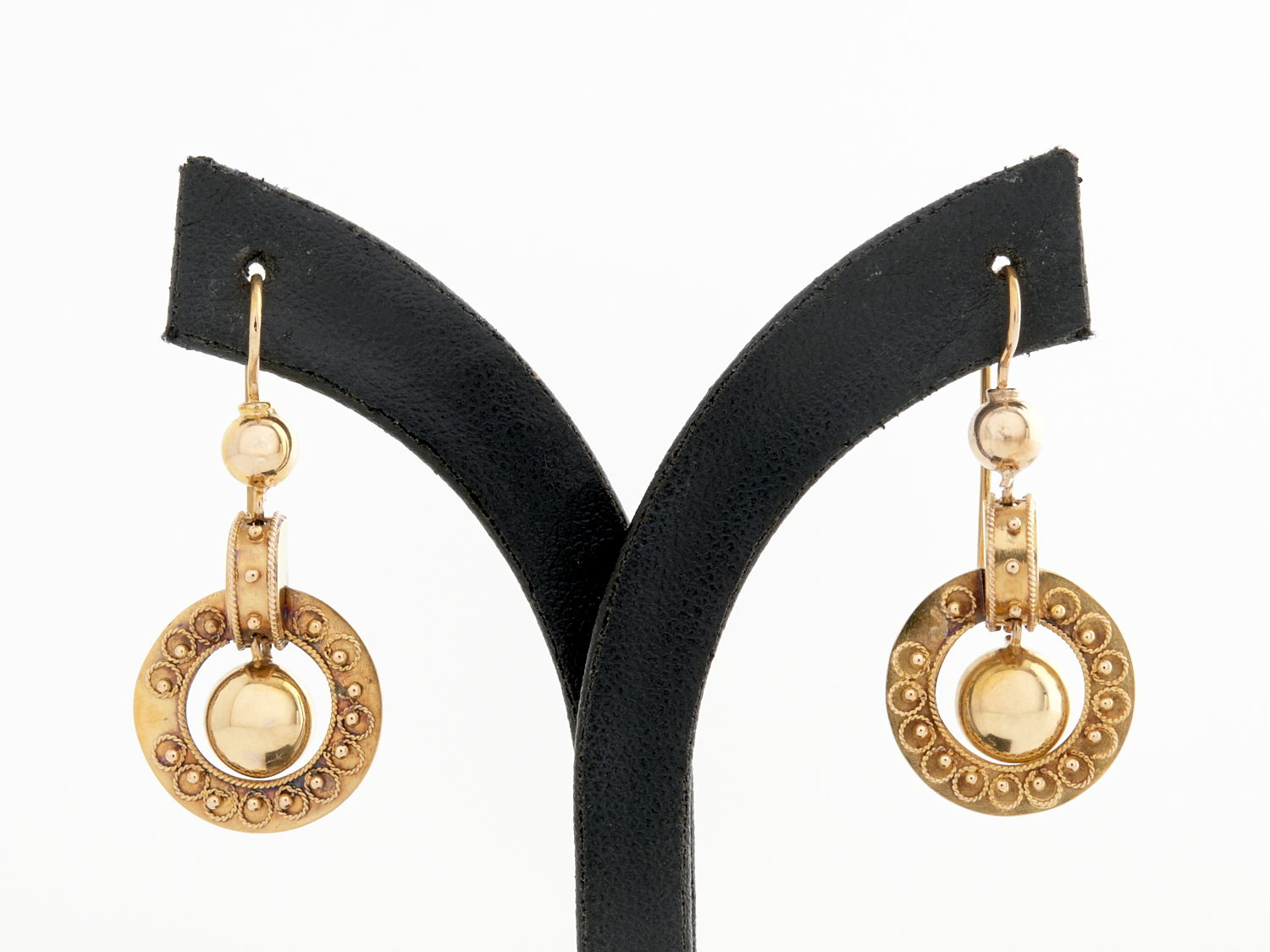 A PAIR OF ETRUSCAN STYLE EARRINGS IN 14CT GOLD, TO SHEPHERD HOOK FITTINGS, 35MM, 3.45GMS