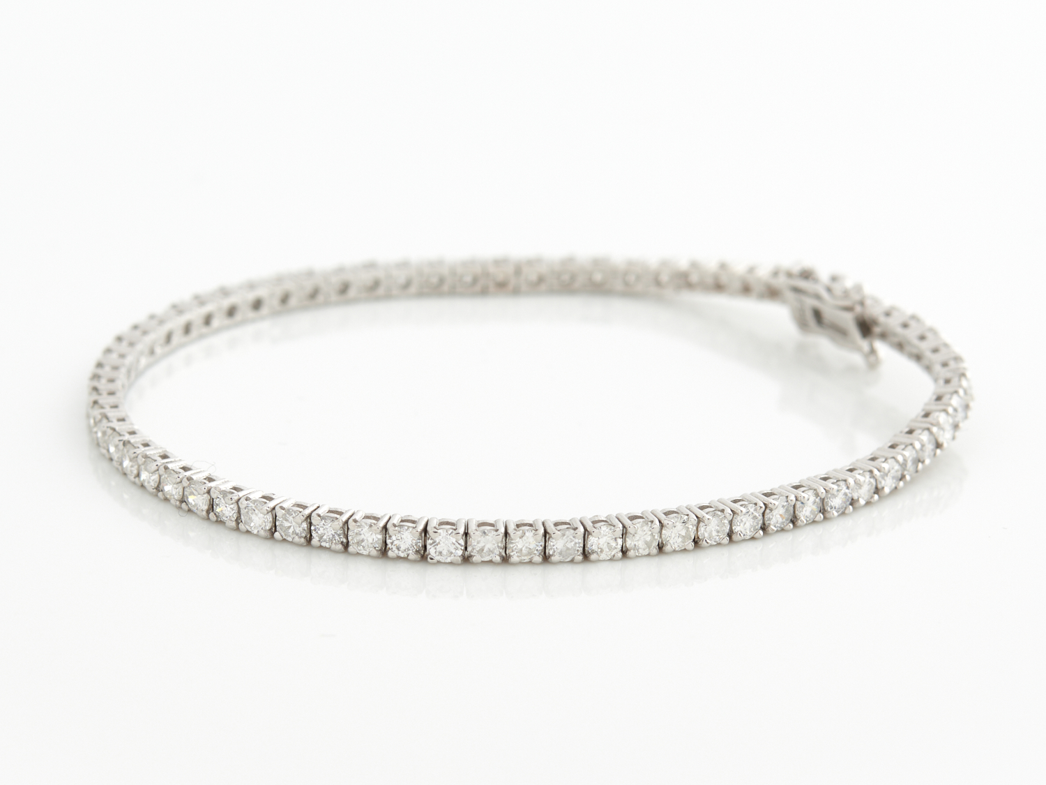 A DIAMOND LINE BRACELET IN 18CT WHITE GOLD, THE DIAMONDS TOTALLING 4.55CTS, 180MM, ACCOMPANIED BY A VALUATION
