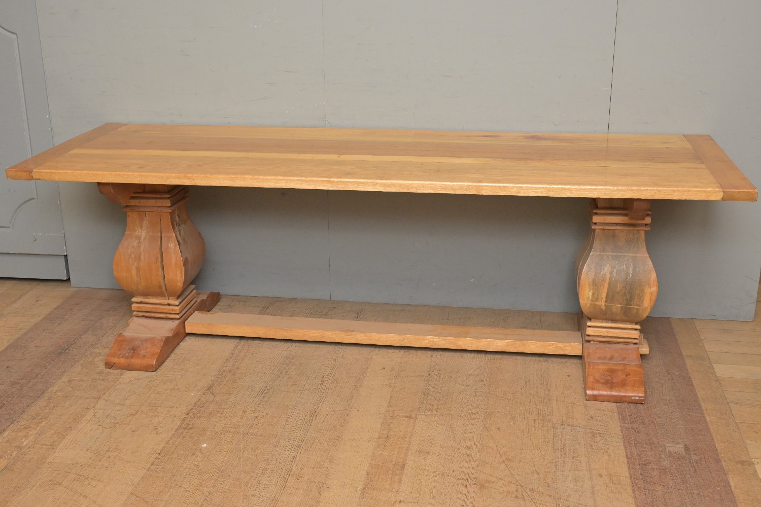 AN ANTIQUE-STYLE REFECTORY TYPE DINING TABLE ON SQUARE BALUSTER SUPPORTS (A/F) (75H X 240W X 80D CM) (PLEASE NOTE THIS HEAVY ITEM MUST BE REMOVED BY CARRIERS AT THE CUSTOMER'S EXPENSE. LEONARD JOEL STAFF CANNOT ASSIST CARRYING THIS ITEM) (LARGE ITEM)