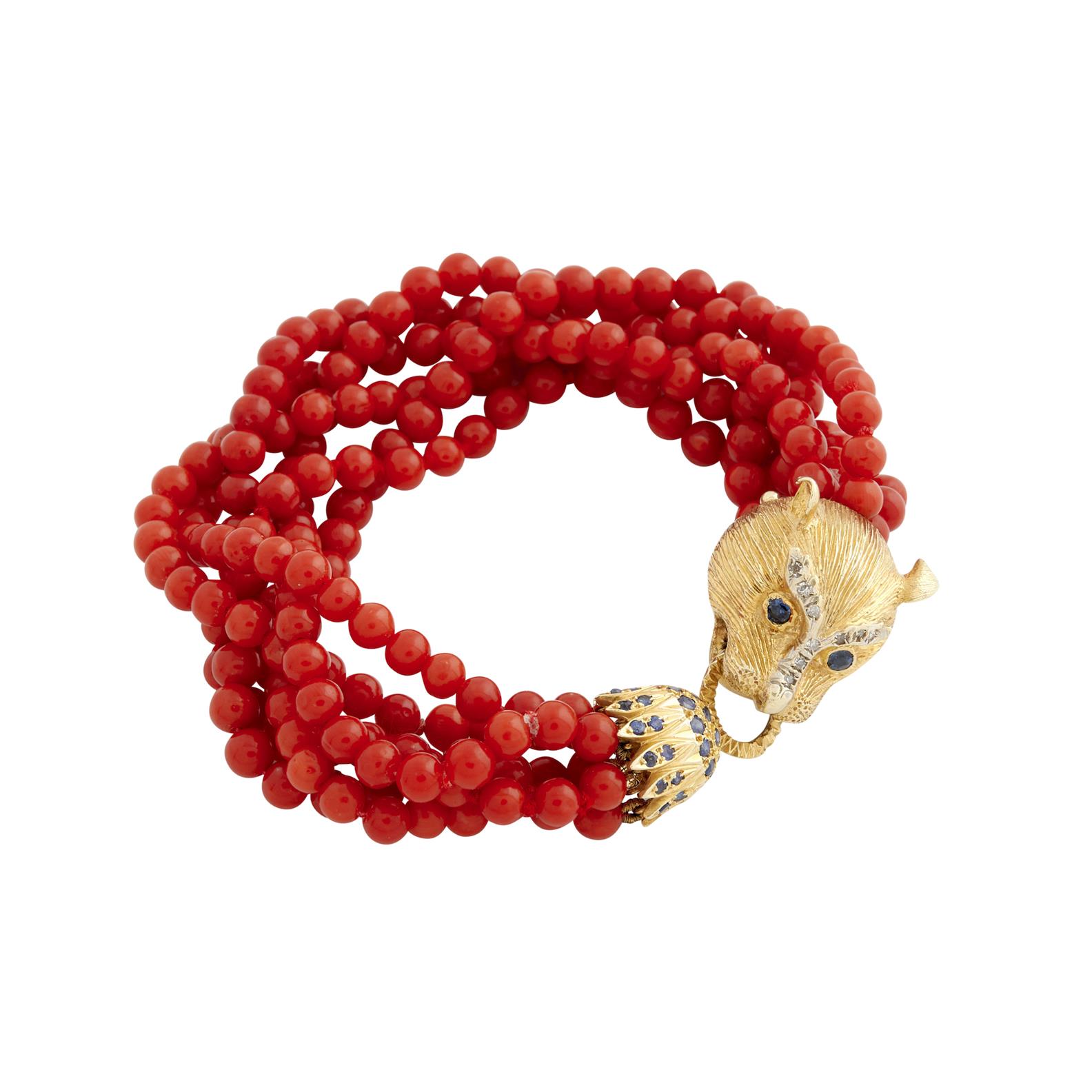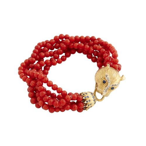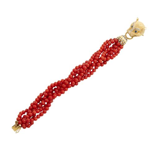 Comprising multi-strands of coral beads, completed by a panther head clasp, detailed with circular-cut sapphires and single-cut diamonds, length 190mm.