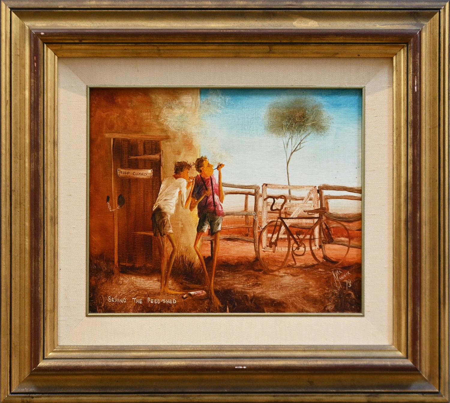 MAX MANNIX, BEHIND THE FEED-SHEAD 1978, OIL ON BOARD, SIGNED AND DATED LOWER RIGHT AND TITLED LOWER LEFT, 24 X 29.5CM, FRAME SIZE: 44 X 48.5CM