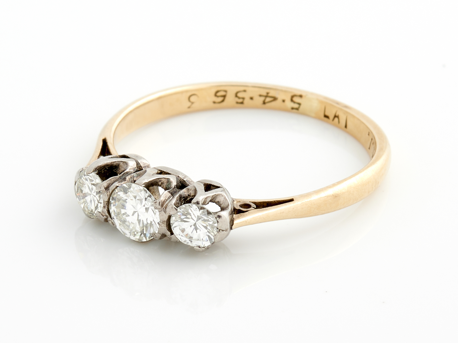 A THREE-STONE DIAMOND RING IN 14CT GOLD AND SILVER, SIZE I, 1.4GMS