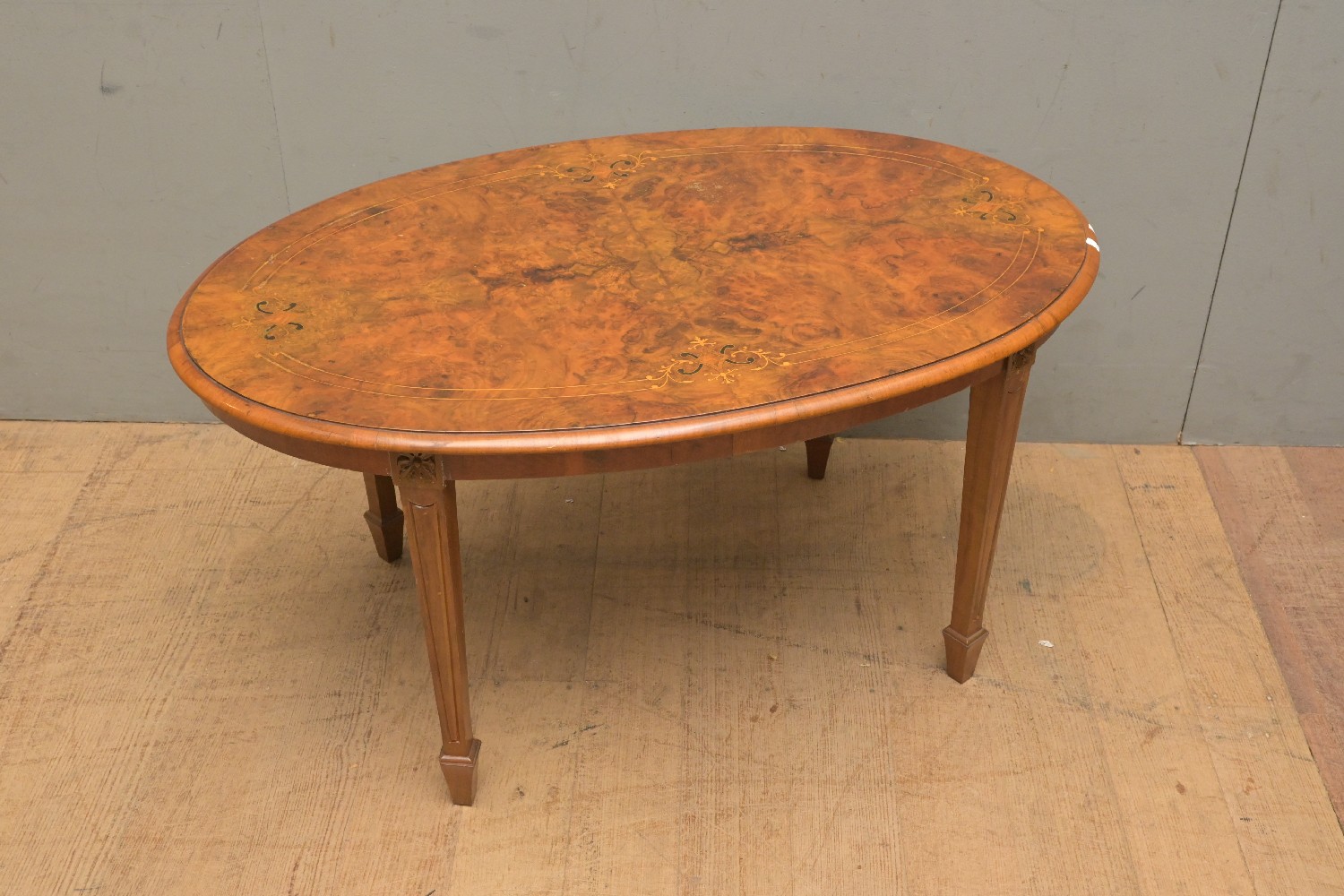 A BURR WALNUT COFFEE TABLE WITH DECORATIVE INLAY (A/F) (47H X 90W X 56D CM) (LEONARD JOEL DELIVERY SIZE: LARGE)
