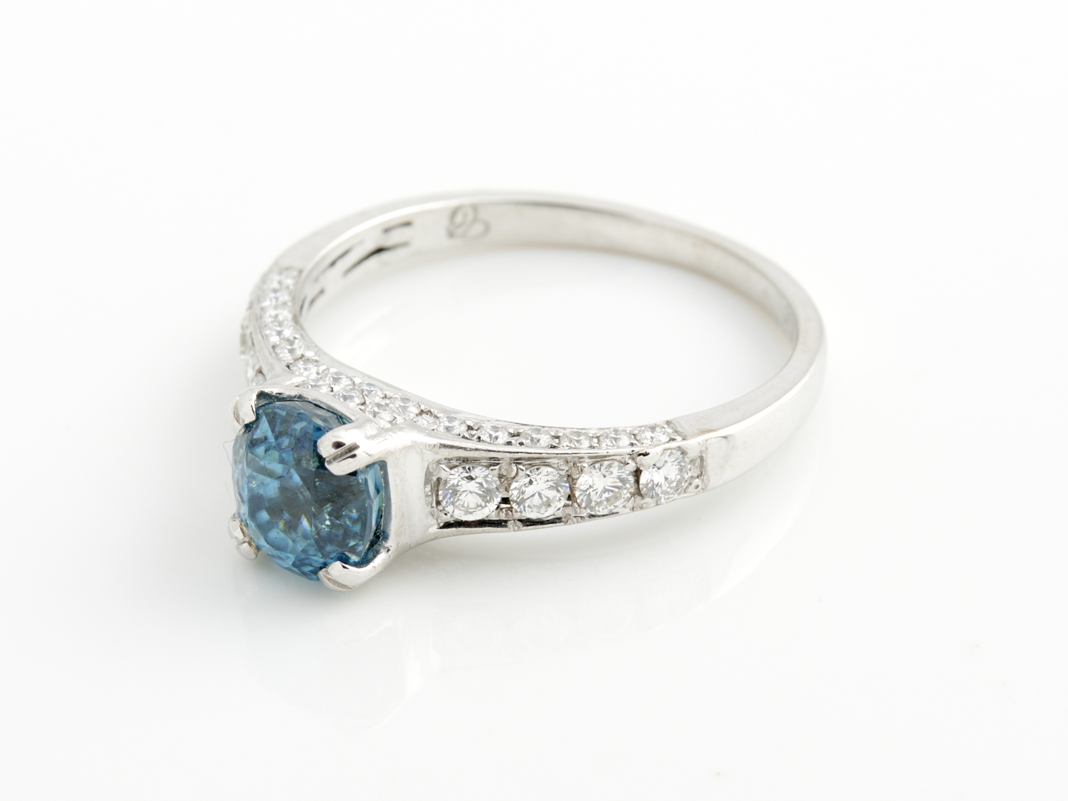 A NATURAL BLUE ZIRCON AND DIAMOND RING IN 18CT WHITE GOLD, THE BLUE ZIRCON WEIGHING 1.98CTS, THE DIAMOND WEIGHING 1.25CTS, SIZE N, 3.3GMS