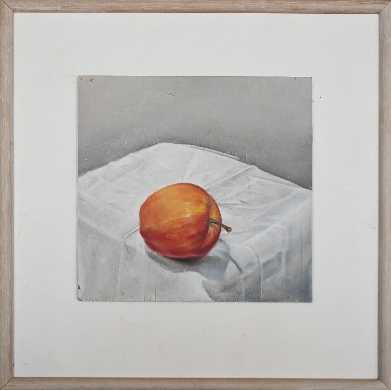 KATE BERGIN, STILL LIFE WITH APPLE 1991, OIL ON PANEL, SIGNED AND DATED VERSO, 20 X 20CM, FRAME SIZE: 34.5 X 34CM