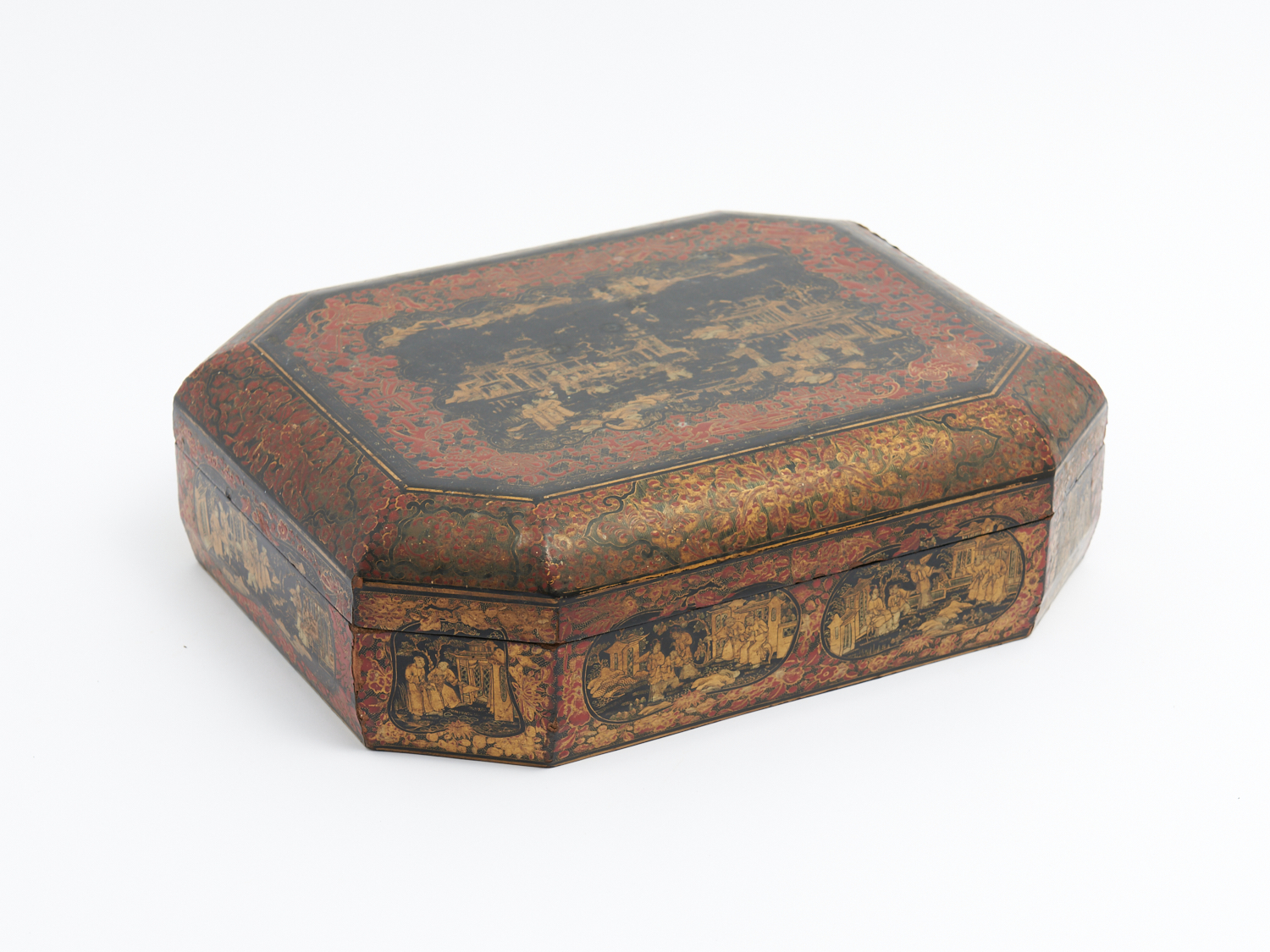 AN ANTIQUE CHINESE EXPORT LACQUER GAMES BOX WITH INTERIOR BOXES, TRAYS AND ANTIQUE DICE W.38CM (A/F, LEGS MISSING, DAMAGE TO INTERIOR BOXES, LOSSES TO ENAMEL AND GILT), LEONARD JOEL DELIVERY SIZE: MEDIUM