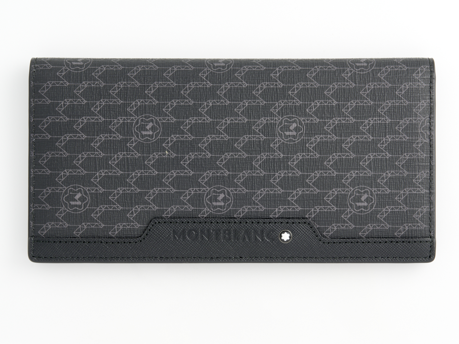 MONT BLANC, A WALLET STYLED IN MONOGRAMMED COATED CANVAS AND BLACK LEATHER, 10 X 19 X 1CM, ACCOMPANIED BY DUSTBAG AND BOX