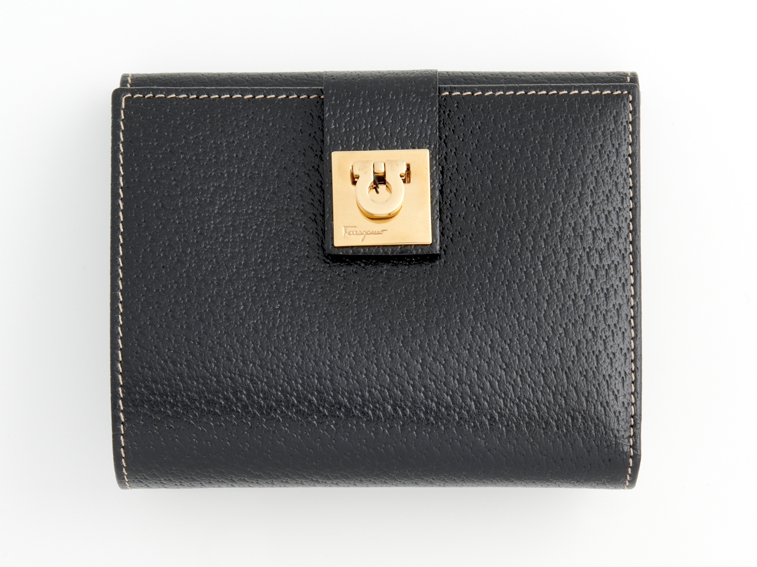 SALVATORE FERRAGAMO, A WALLET STYLED IN BLACK LEATHER WITH GOLD TONE METAL HARDWARE, 10 X 12 X 3CM, ACCOMPANIED BY A BOX