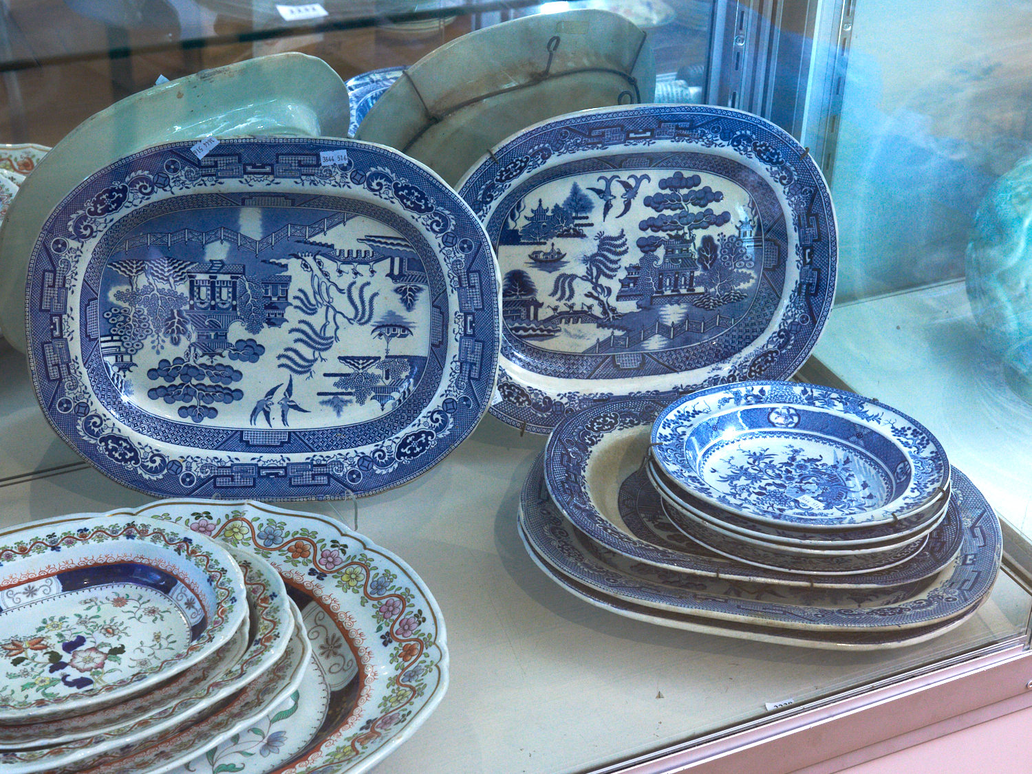 A GROUP OF FIVE BLUE AND WHITE WILLOW SOFT PORCELAIN SERVING DISHES WITH ADDITIONAL BLUE AND WHITE PIECES L.40CM (LARGEST) (A/F), LEONARD JOEL DELIVERY SIZE: LARGE