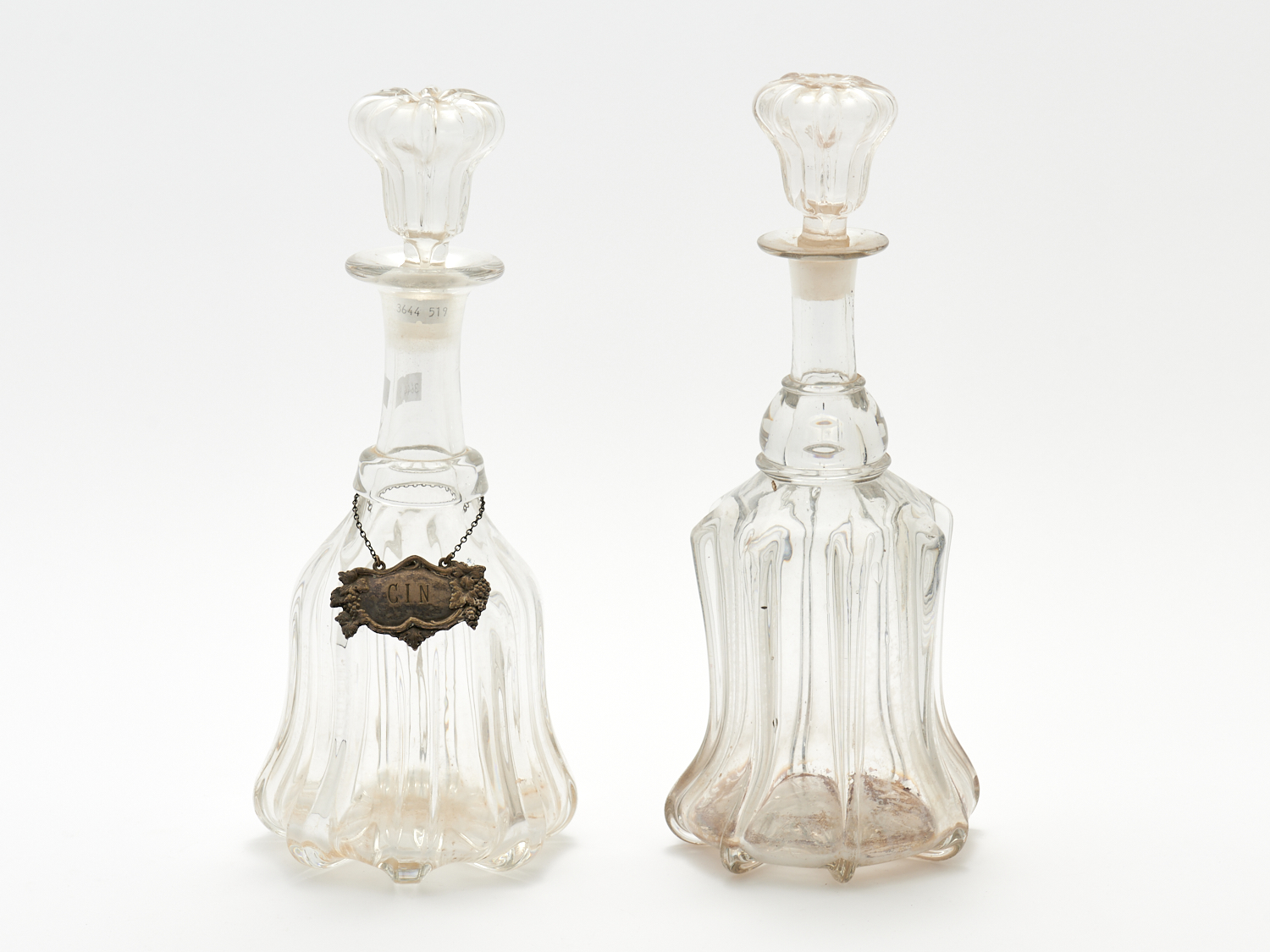 TWO SIMILAR ANTIQUE MOULDED GLASS DECANTERS (ONE WITH LABEL) 22.5CM, LEONARD JOEL DELIVERY SIZE: MEDIUM