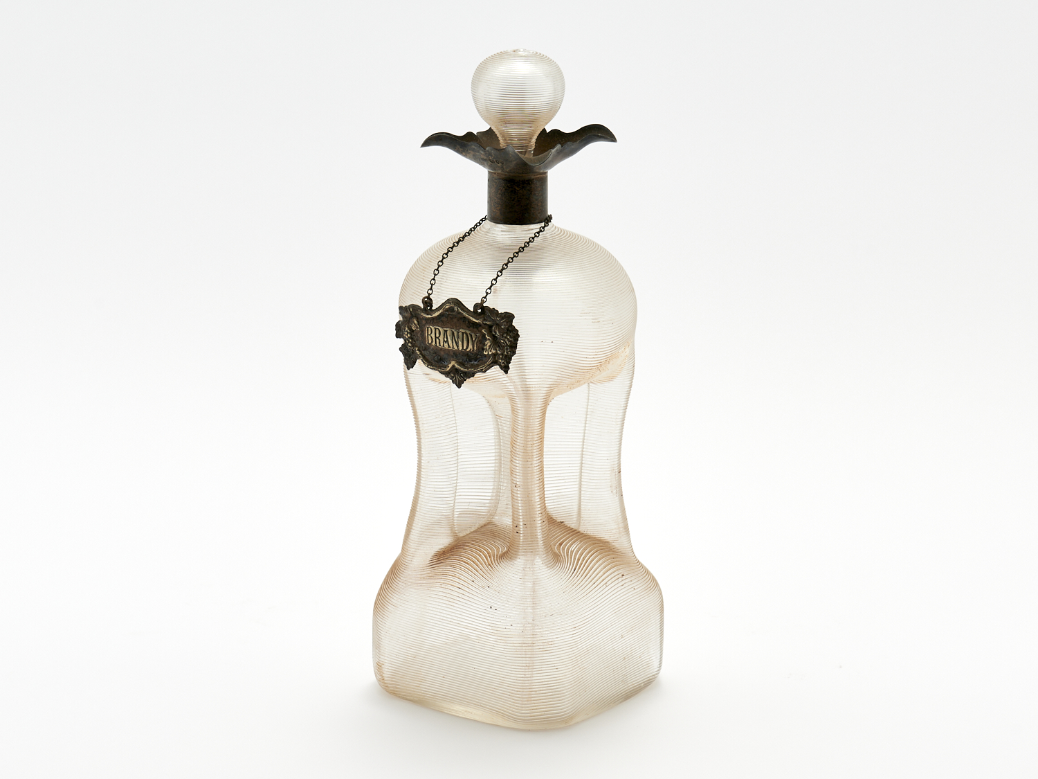 AN ANTIQUE TEXTURED GLASS DECANTER WITH BRANDY LABEL H.30CM , LEONARD JOEL DELIVERY SIZE: SMALL