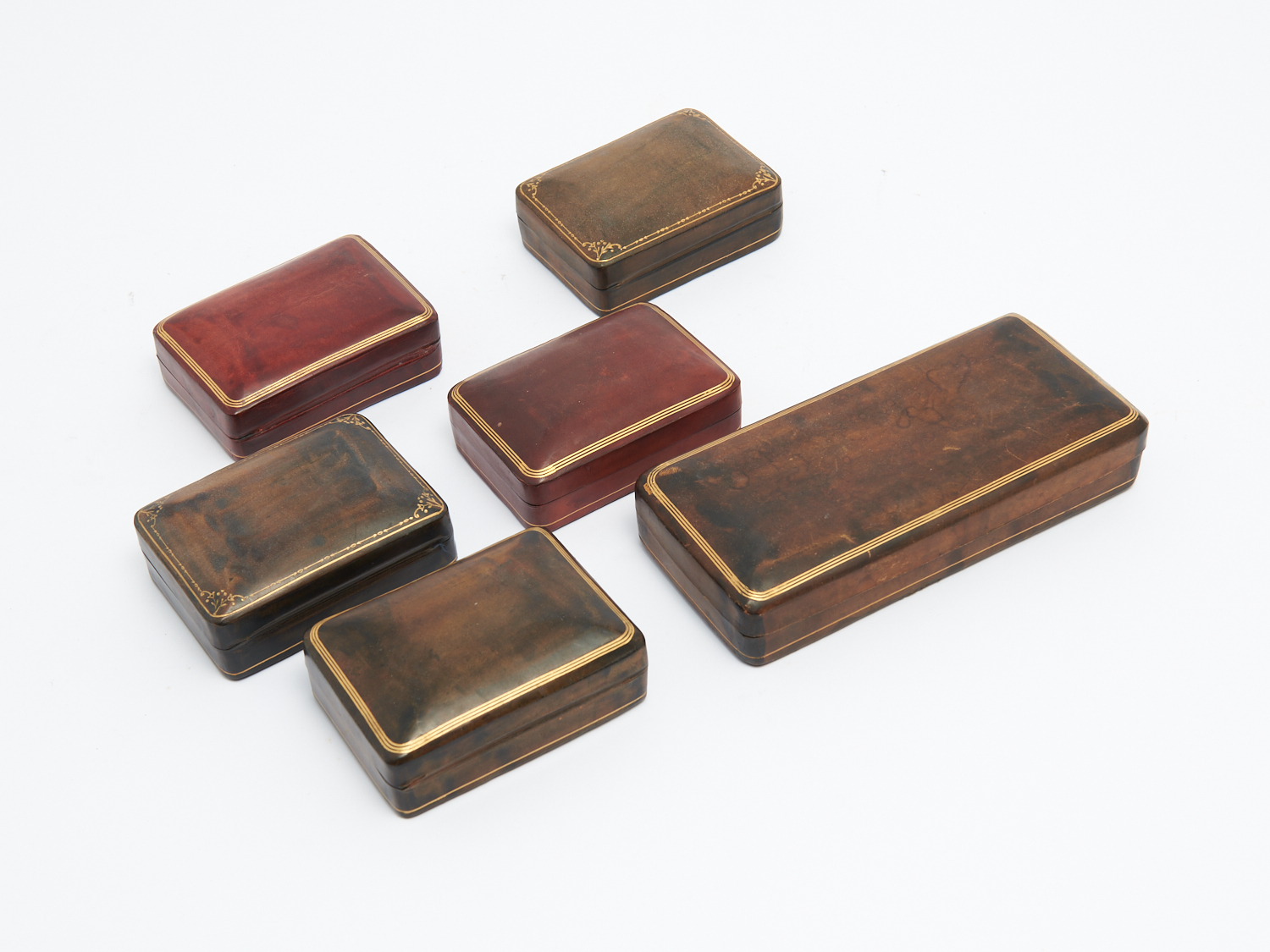 A GROUP OF SIX VINTAGE ITALIAN LEATHER BOXES WITH GILT DETAILING L.20.5CM (LONGEST), LEONARD JOEL DELIVERY SIZE: SMALL