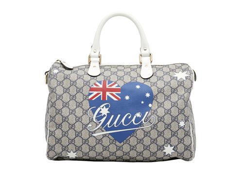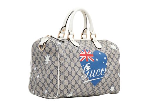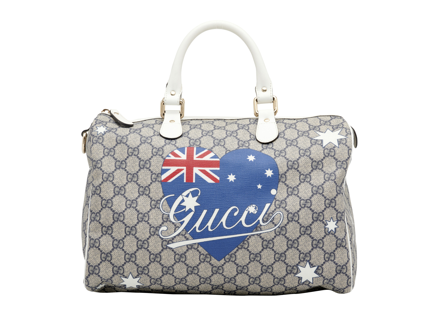 Styled in GG Supreme coated canvas with white leather trim, featuring Australian flag and Southern Cross print, 21 x 32 x 18cm.
