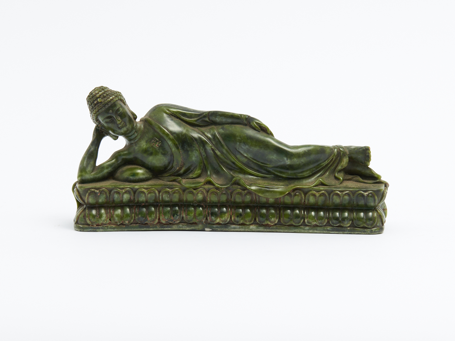 A COMPOSITE GREEN RESTING BUDDHA L23CM, LEONARD JOEL DELIVERY SIZE: SMALL