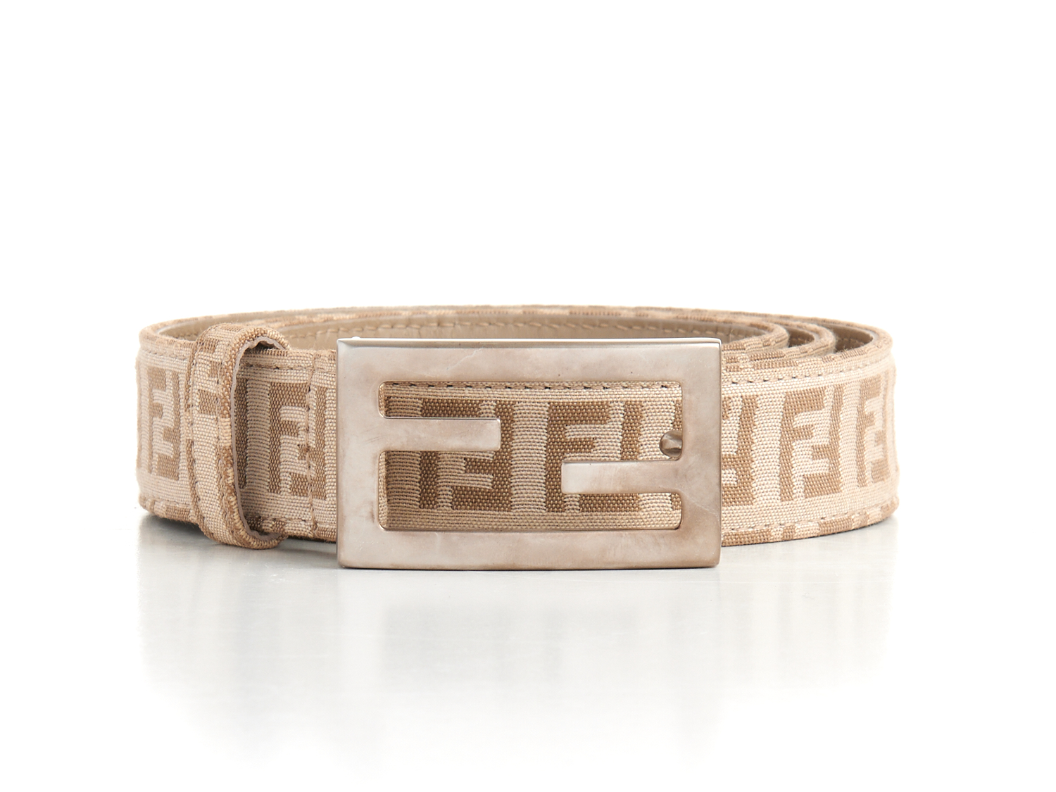 Styled in beige Zucca canvas with frosted silver tone hardware, marked size 85/34.