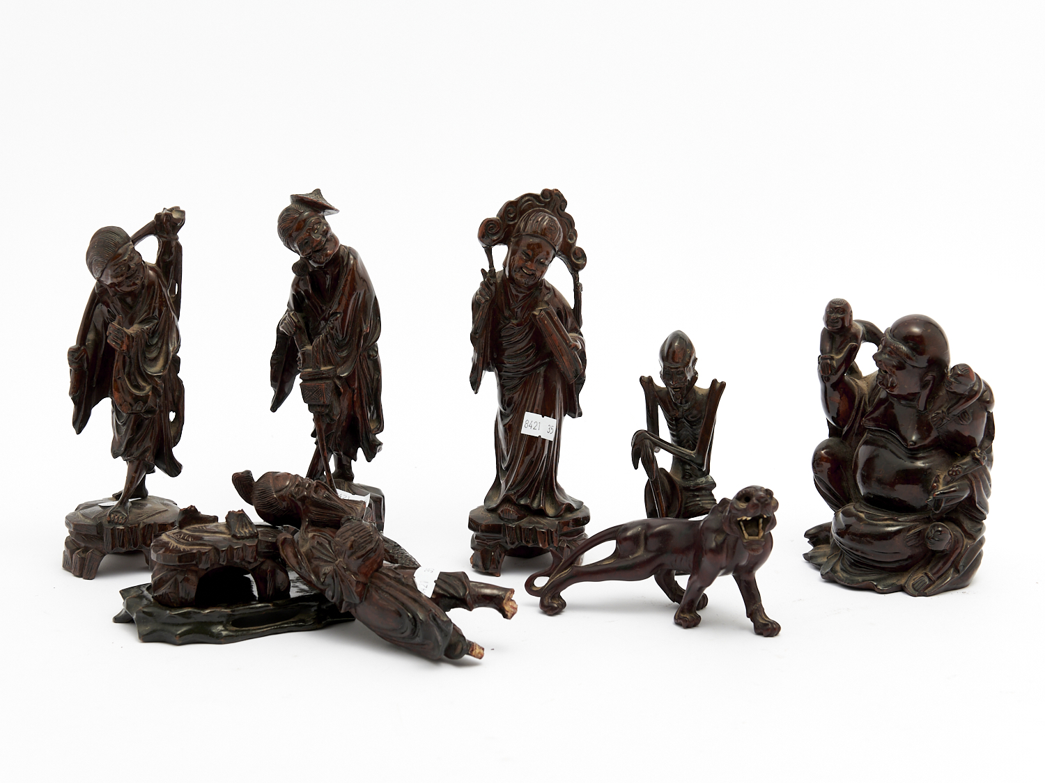 A COLLECTION OF SEVEN CHINESE WOOD CARVED FIGURES (A/F) H.21.5CM (TALLEST), LEONARD JOEL DELIVERY SIZE: MEDIUM