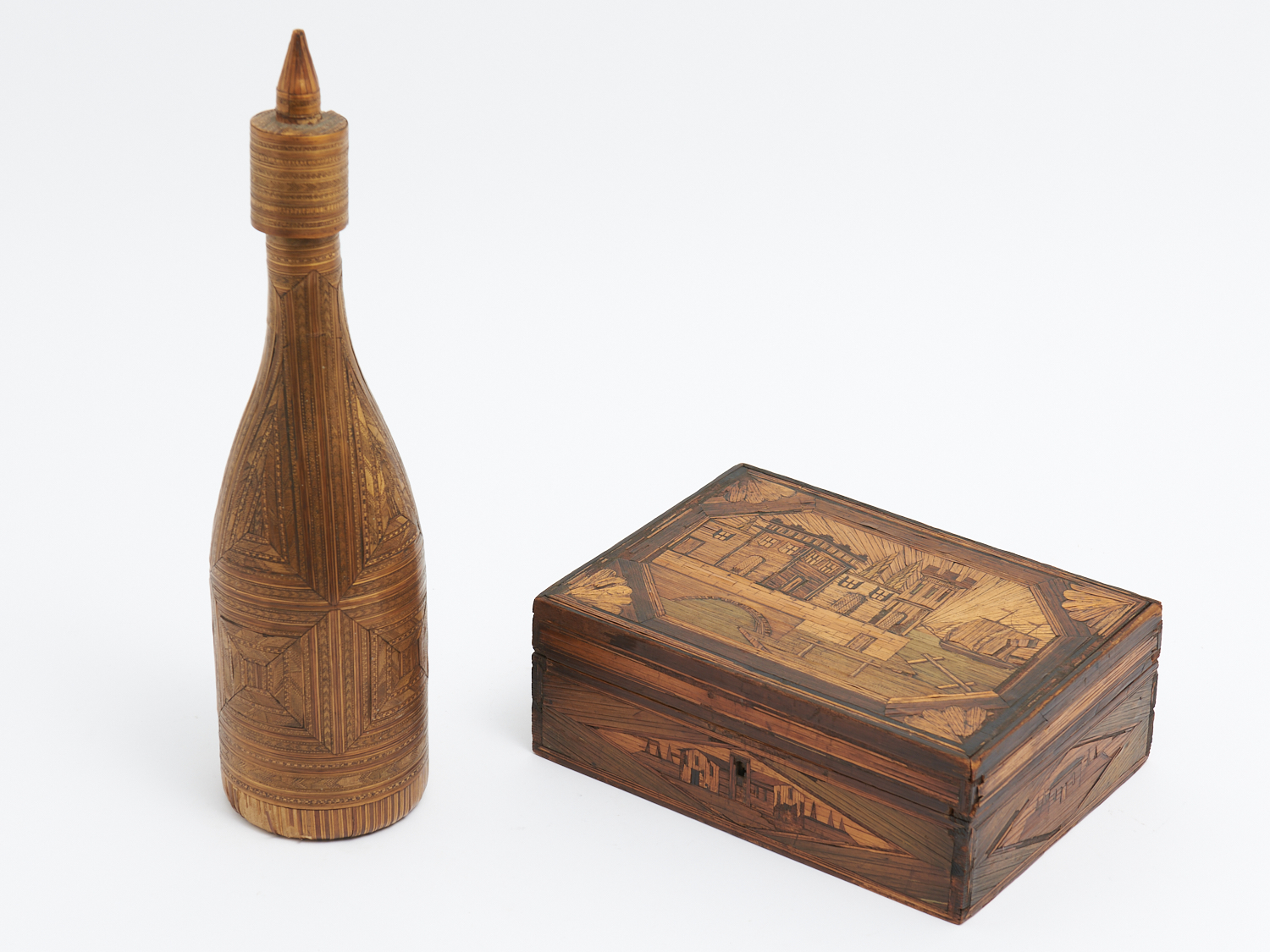 A PAIR OF ANTIQUE STRAW MARQUETRY PIECES INCL. A BOX WITH CASTLE AND SHIP SCENE AND A BOTTLE H.37CM (TALLEST) (A/F), LEONARD JOEL DELIVERY SIZE: MEDIUM