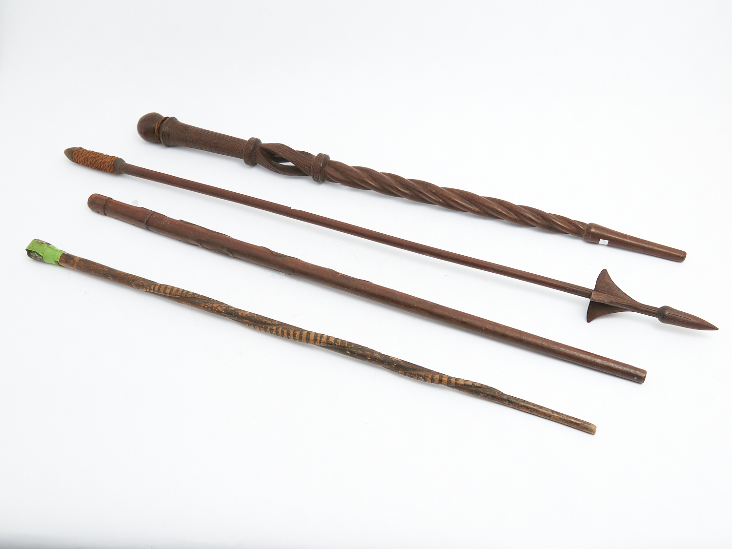 A COLLECTION OF FOUR CARVED WOODEN WALKING STICKS INCLUDING ONE WITH A TWIST MOTIF, ANOTHER WITH A HARPOON END, AND ANOTHER WITH A SNAKE L.105CM, LEONARD JOEL DELIVERY SIZE: LARGE