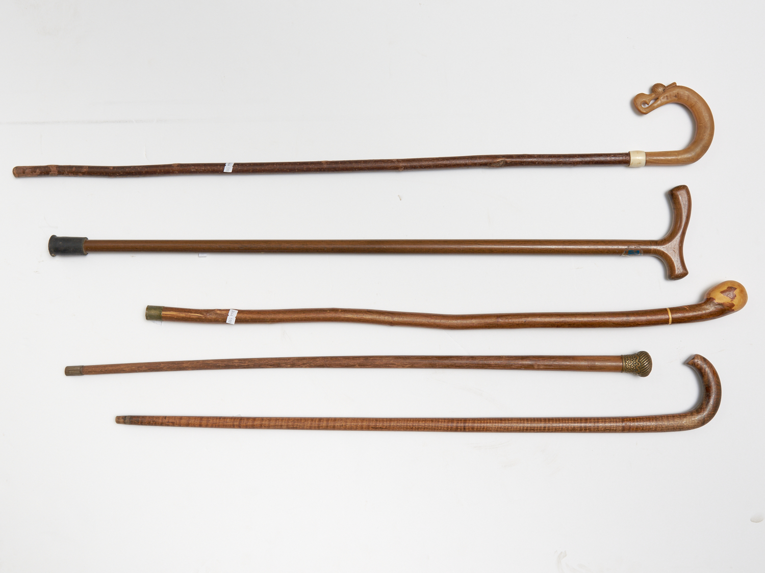 A COLLECTION OF FIVE ANTIQUE AND LATER WOODEN WALKING STICKS L.106CM (LONGEST), LEONARD JOEL DELIVERY SIZE: LARGE