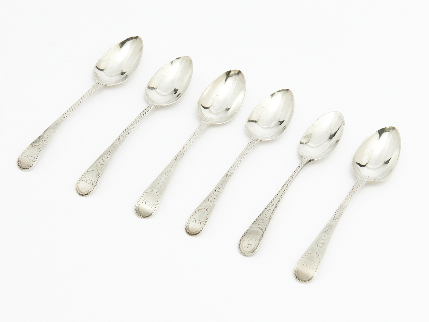 A SET OF SIX GEORGIAN STERLING SILVER TEASPOONS 86G L.13CM, LEONARD JOEL DELIVERY SIZE: SMALL