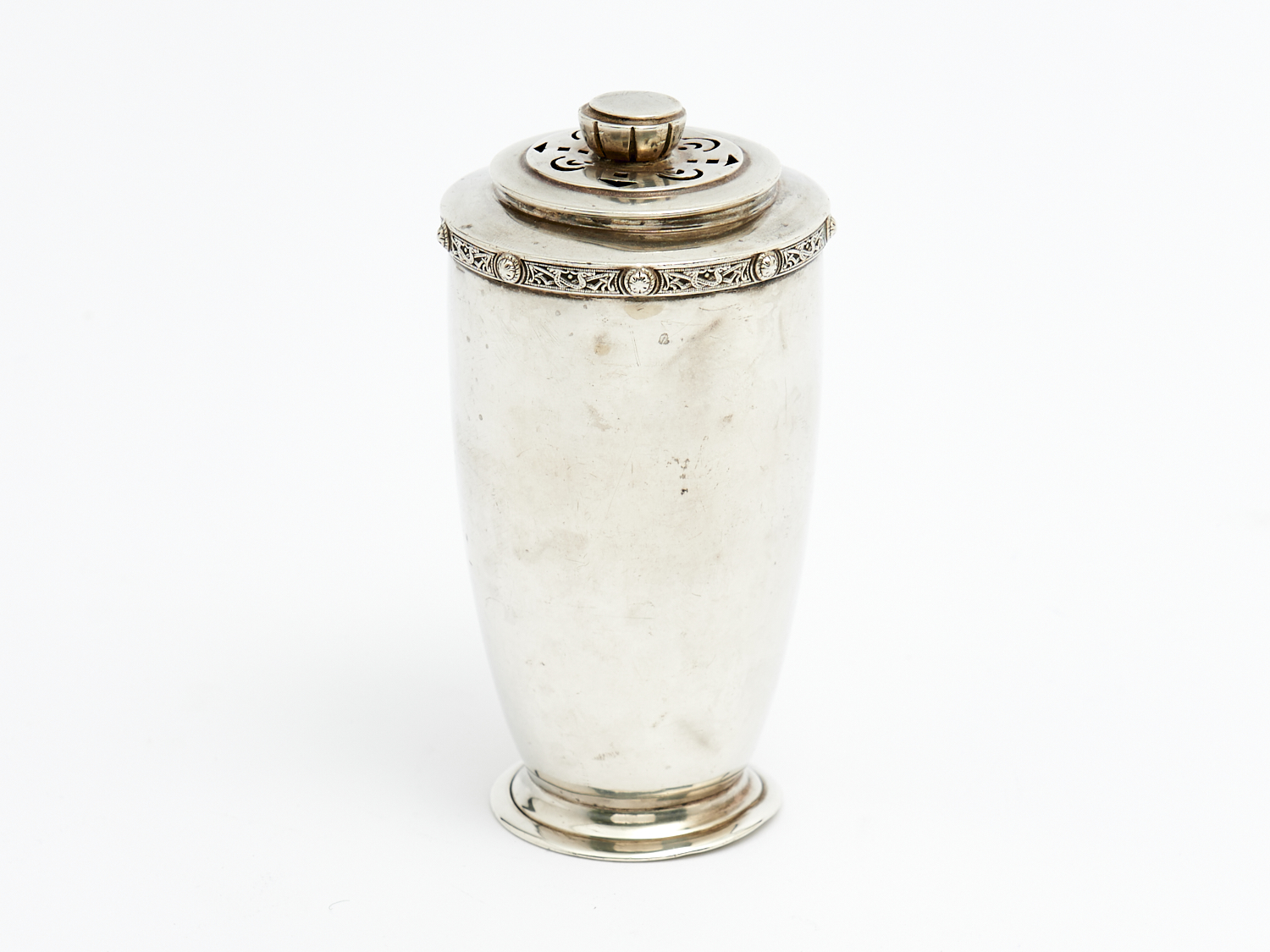 AN ART DECO STERLING SILVER CASTER 122G H.11.5CM, LEONARD JOEL DELIVERY SIZE: SMALL