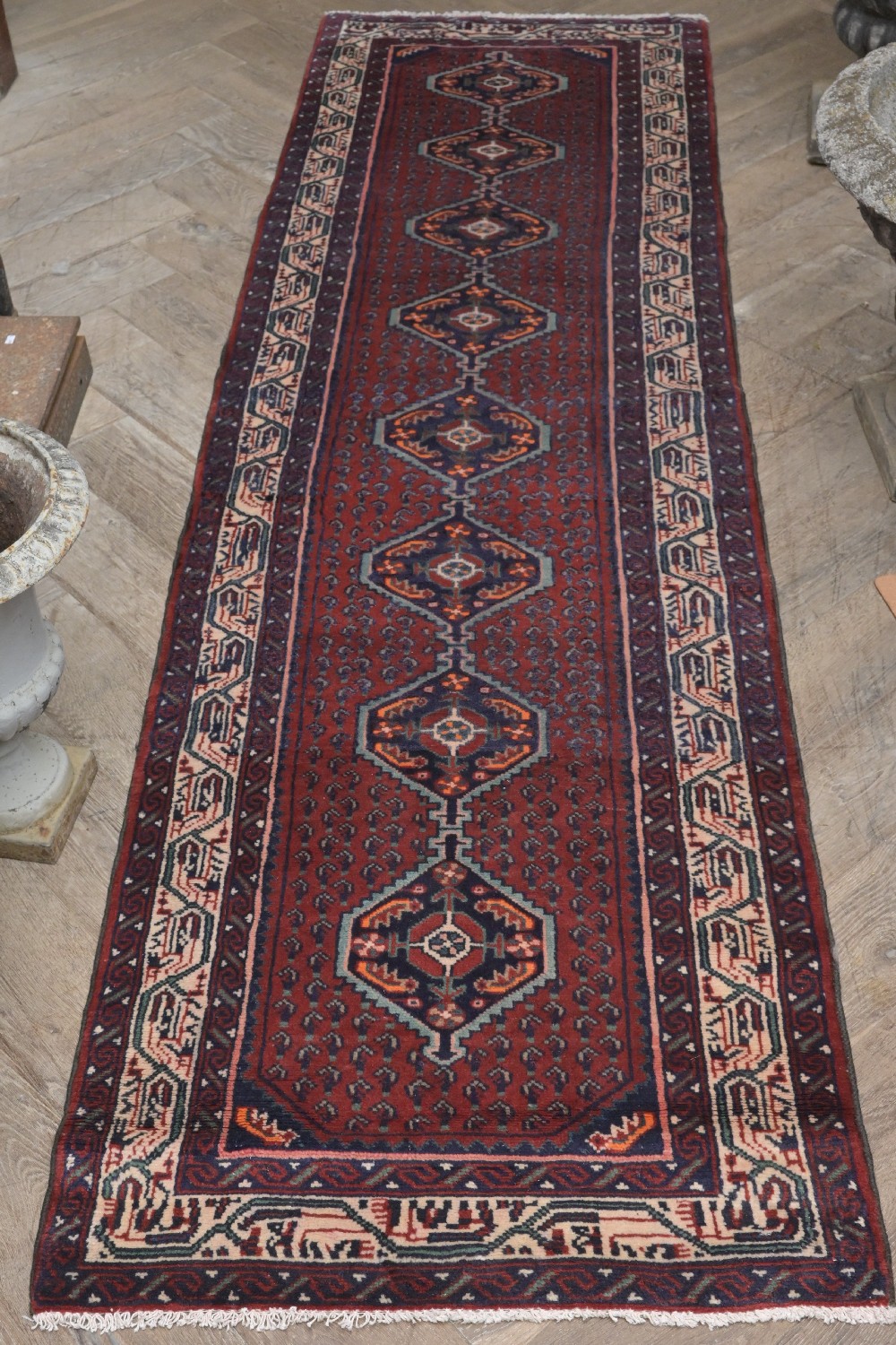 PERSIAN SERABAND RUNNER 100% PLUSH WOOL PILE. HAND-KNOTTED WEAVE WITH A DESIGN OF CONTINUING HEXAGONAL- SHAPED MEDALLIONS CONTAINING MOTIFS, SET WITHIN A RED FIELD OF ALL OVER PAISLEY MOTIFS. SERABAND DESIGN BORDER. SIZE: 290 X82CM ORIGIN: PERSIA – RRP: $1,500 DOCUMENTATION OF AUTHENTICITY INCLUDED.