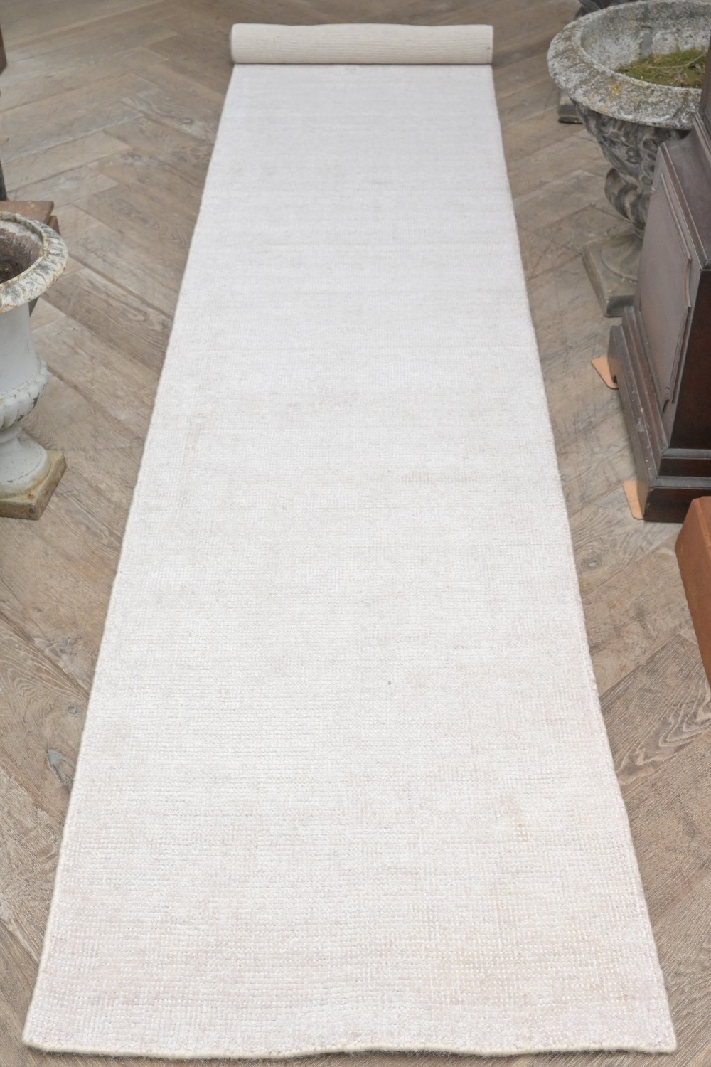 A NEW MODERN HANDLOOMED RUNNER. WOOL AND SILKY TEXTURE. IN TONES OF CREAM. SIZE: 387 X 75 CM - RRP: $1,300 ORIGIN: INDIA