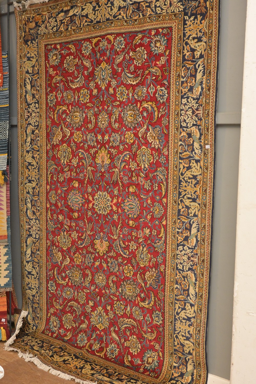FINE PERSIAN QUM RUG, 100% FINE LAMBS WOOL AND WEAVE. ALL OVER DESIGN OF SHAH ABASI PALMETTES, BIRDS OF PHOENIX AND PARADISE, DEERS AND TWO PEACOCKS THAT HAVE SILK HIGHLIGHTS, ON A RICH ROYAL CRIMSON AND GOLD FIELD. BORDER OF DEER AND BIRD MOTIFS ON A ROYAL BLUE FIELD. IN EXCELLENT GALLERY CONDITION. SIZE: 270 X 164 CM ORIGIN: PERSIA - RRP: $5,100 DOCUMENTATION OF AUTHENTICITY INCLUDED.