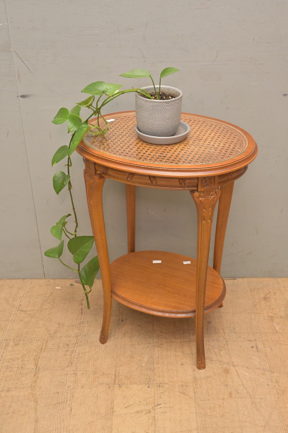 A RATTAN TOPPED TWO TIER SIDE TABLE WITH GLASS TOP (63H X 48W X 38D CM) (LEONARD JOEL DELIVERY SIZE: LARGE)