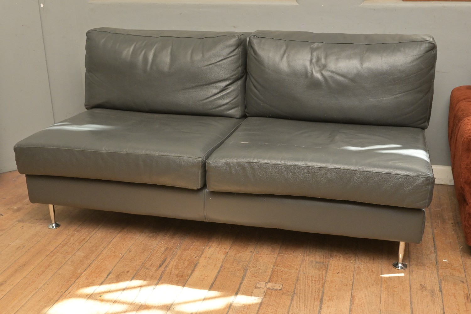 A LEATHER TWO SEATER SOFA (A/F) (79H X 173W X 103D CM) (PLEASE NOTE THIS HEAVY ITEM MUST BE REMOVED BY CARRIERS AT THE CUSTOMER'S EXPENSE. LEONARD JOEL STAFF CANNOT ASSIST CARRYING THIS ITEM) (LARGE ITEM)