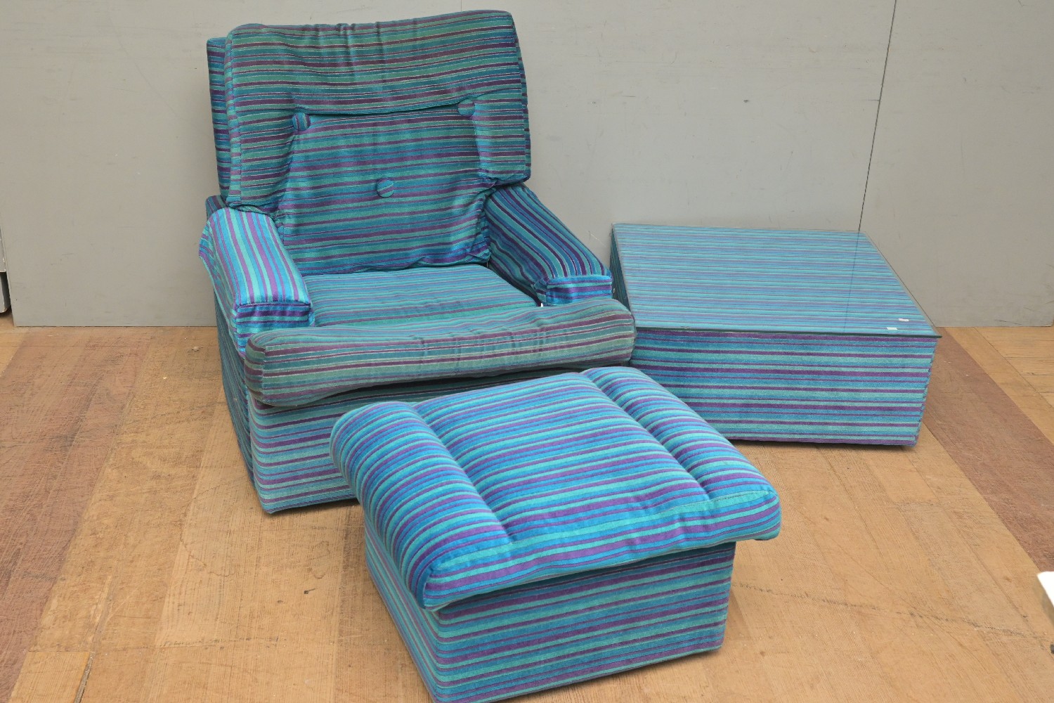 A MID CENTURY AUSTRALIAN MADE FLER THREE-PIECE LOUNGE SETTING COMPRISING ARMCHAIR, FOOTSTOOL AND COFFEE TABLE (A/F) (81H X 80W X 86D CM) (PLEASE NOTE THIS HEAVY ITEM MUST BE REMOVED BY CARRIERS AT THE CUSTOMER'S EXPENSE. LEONARD JOEL STAFF CANNOT ASSIST CARRYING THIS ITEM) (LARGE ITEM)