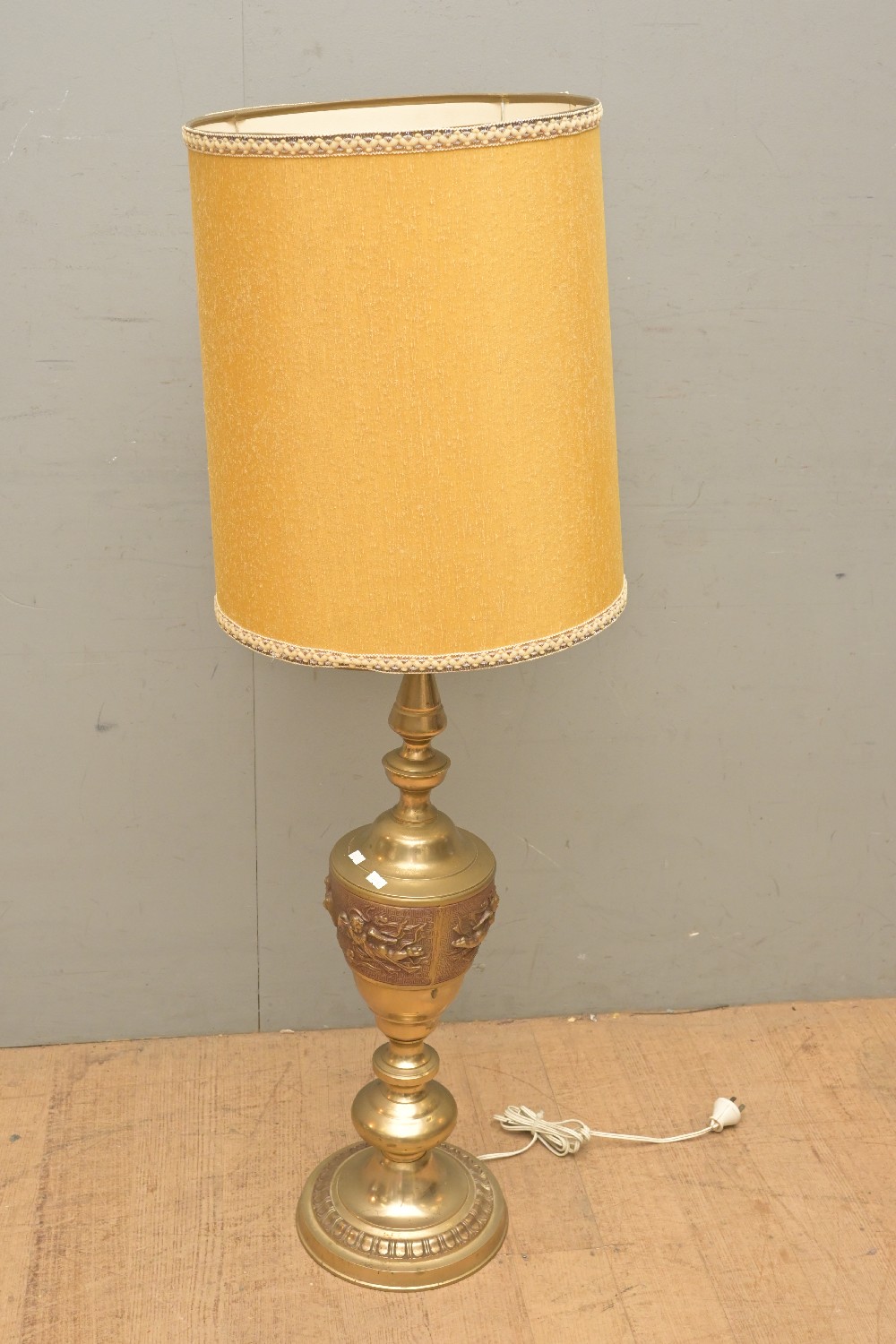 AN EARLY 20TH CENTURY ITALIAN SOLID BRASS CHERUB FORM TABLE LAMP WITH ORIGINAL SHADE - NEEDS REWIRING (A/F) (124H CM) (LEONARD JOEL DELIVERY SIZE: LARGE)