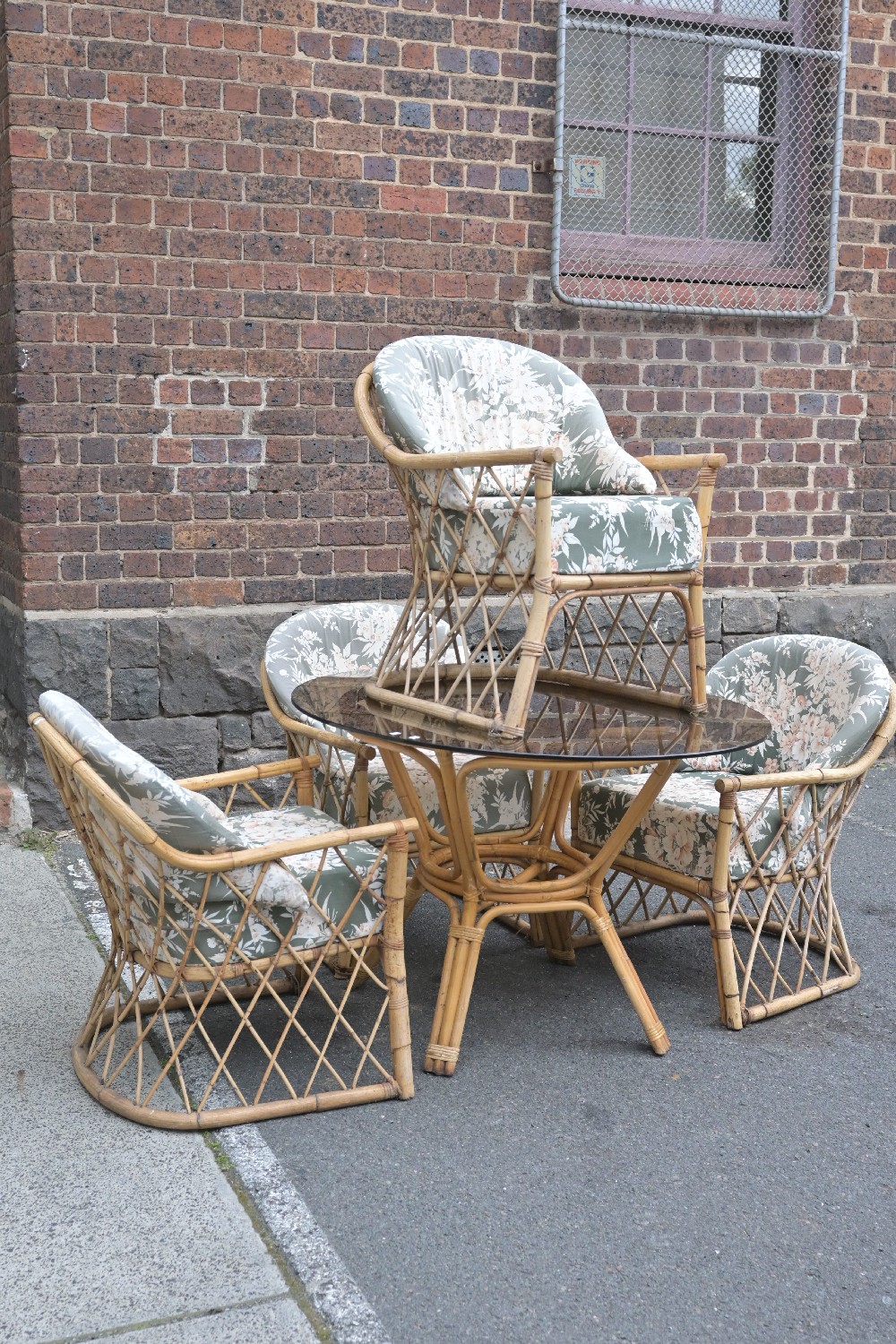 A CANE BREAKFAST SUITE OF A CIRCULAR GLASS-TOPPED TABLE AND FOUR CHAIRS, WITH ORIGINAL CUSHIONS (A/F) (73H X 107DIA CM) (LEONARD JOEL DELIVERY SIZE: X-LARGE)