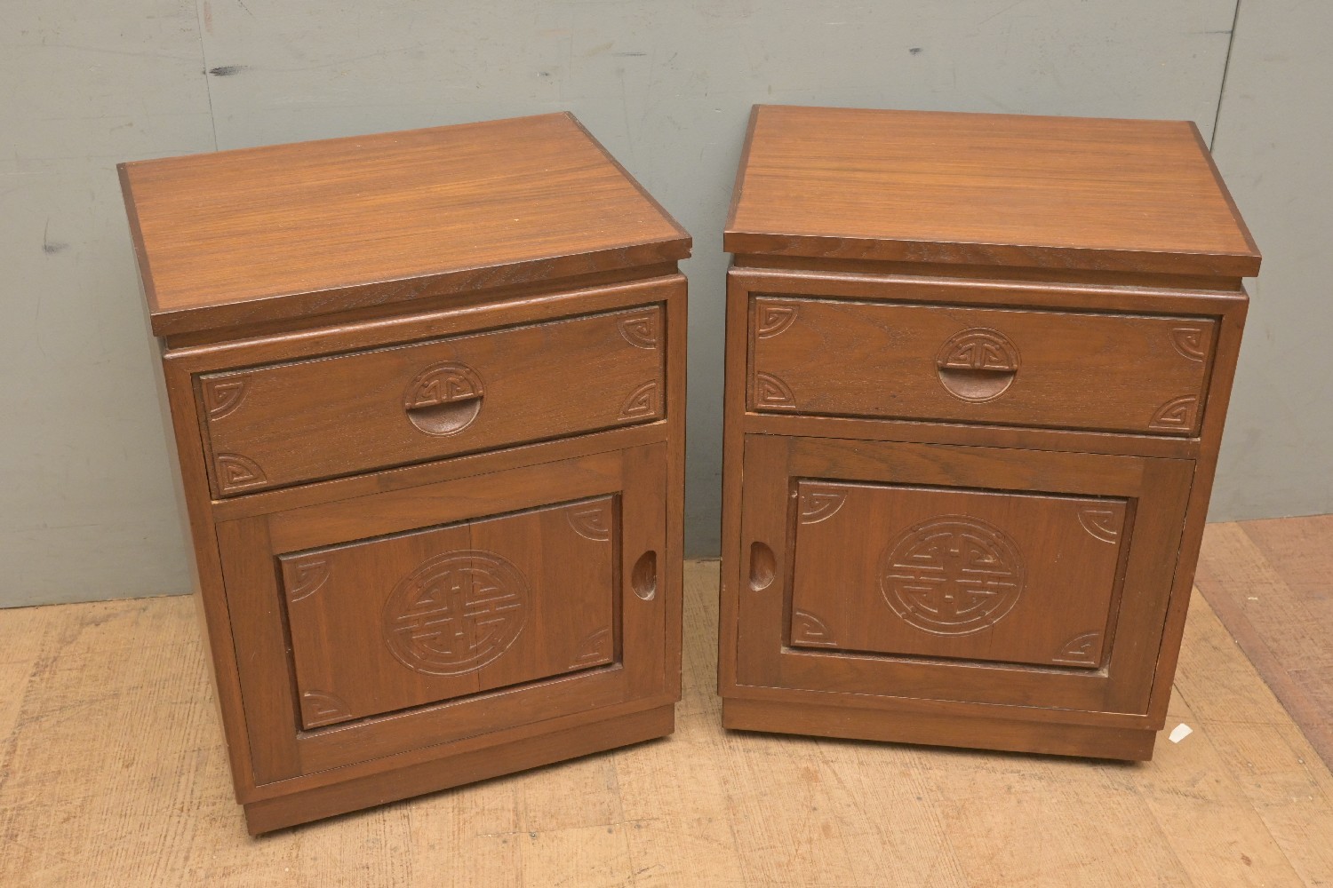 A PAIR OF CONTEMPORARY CHINESE STYLE BEDSIDES ON CASTORS (A/F) (59H X 46W X 36D CM) (LEONARD JOEL DELIVERY SIZE: X-LARGE)